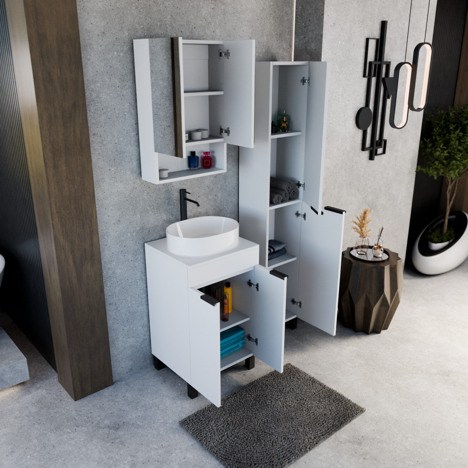Napjainkban a praktikum mellett a fürdőszoba esztétikus megjelenése is fontos szempont. A lábon álló bútorok egyre elterjedtebbé válnak, mivel számos előnnyel rendelkeznek, ide sorolható a modern, könnyed megjelenés és az egyszerű tisztítás. A lábon álló fürdőszobai bútorok a klasszikus és modernebb stílusú fürdőszobákban is megállják a helyüket egyaránt. Nagyfokú rugalmasság jellemzi őket, mivel szinte bárhol elhelyezhetők a fürdőszobán belül. További előnyük, hogy soft close (csillapítós) zsanérral felszereltek, így  becsukáskor az ajtó vagy fiók finoman záródik be, csökkentve a terhelést és növelve az élettartamot. A szekrény fehér és matt fekete mosdóval, illetve mosdópulttal is szabadon kombinálható ízlés szerint. A teljesség érdekében a mosdószekrényekhez illő tükrös szekrényt és magasszekrényt is választhatunk, hogy a fürdőszobában lévő bútorok egy szemet gyönyörködtető egységet alkossanak.