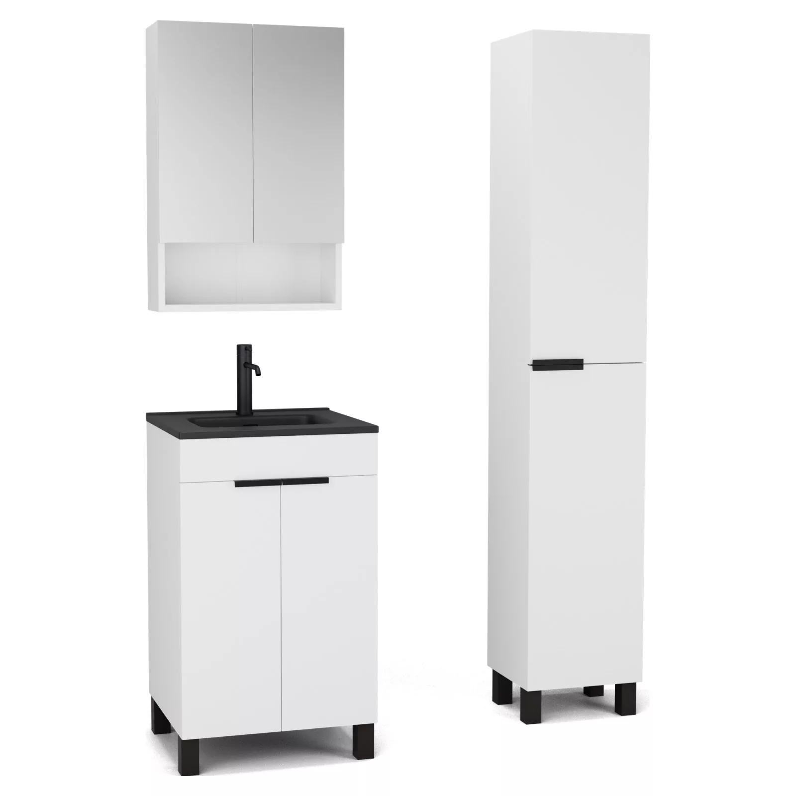 Saját márkás 50 cm széles komplett fürdőszoba bútor álló mosdószekrénnyel matt fehér színben, matt fekete fogantyúkkal és lábakkal, tükrös szekrénnyel és magasszekrénnyel.