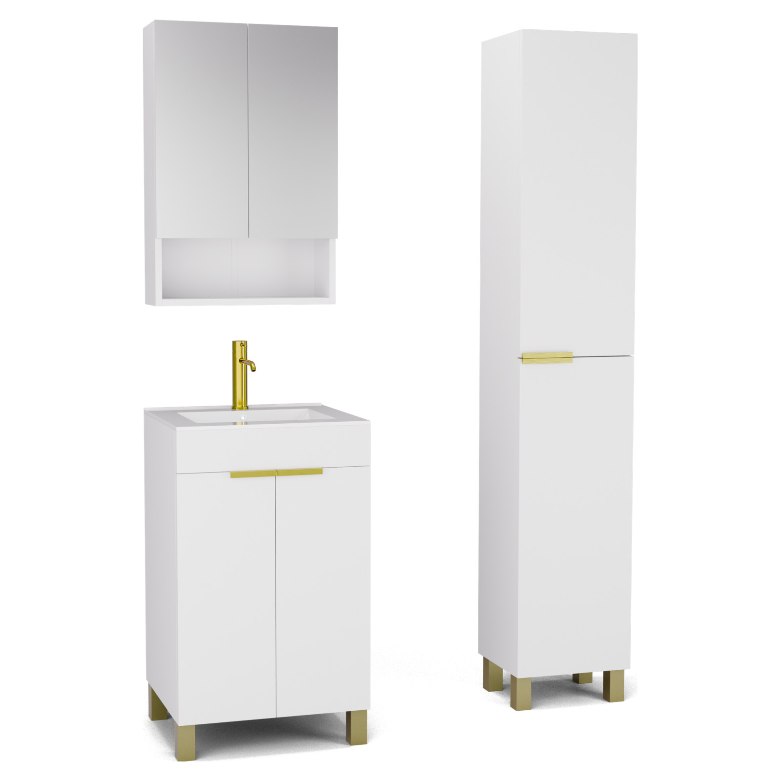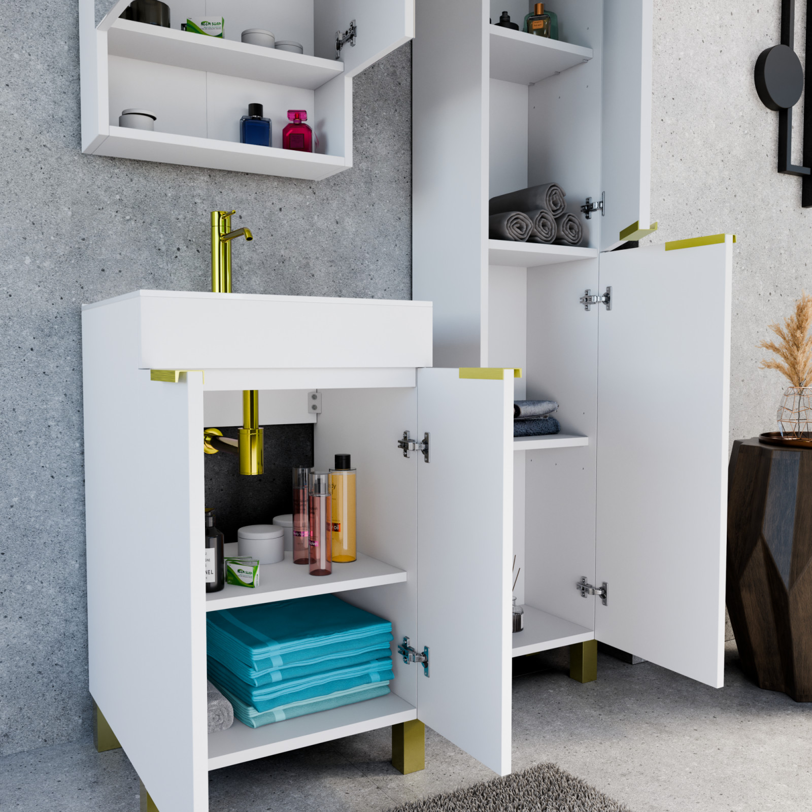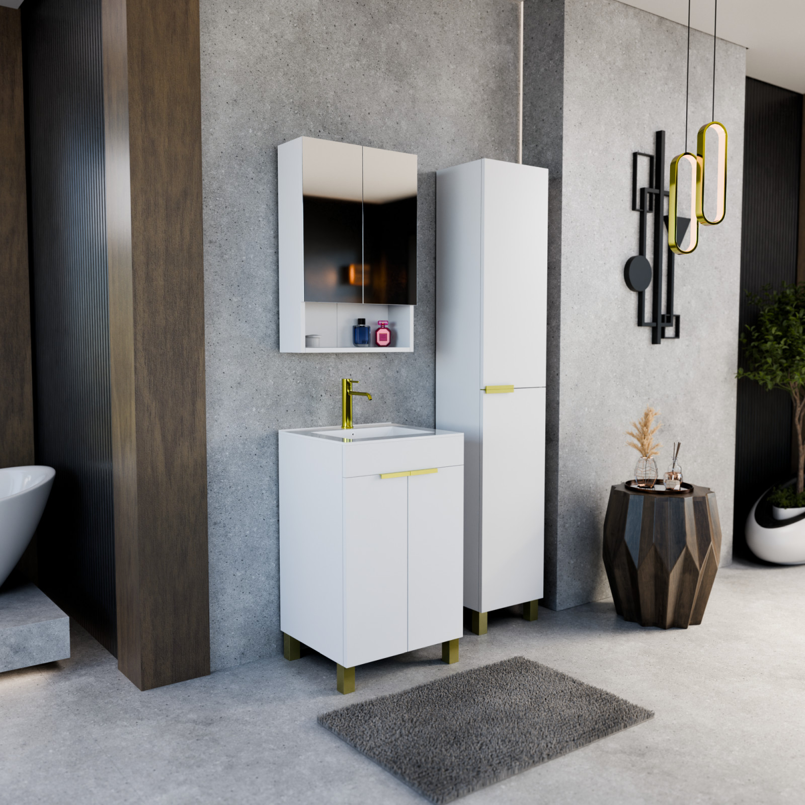 Saját márkás 60 cm széles komplett fürdőszoba bútor álló mosdószekrénnyel matt fehér színben, szálcsiszolt arany fogantyúkkal és lábakkal, tükrös szekrénnyel és magasszekrénnyel.