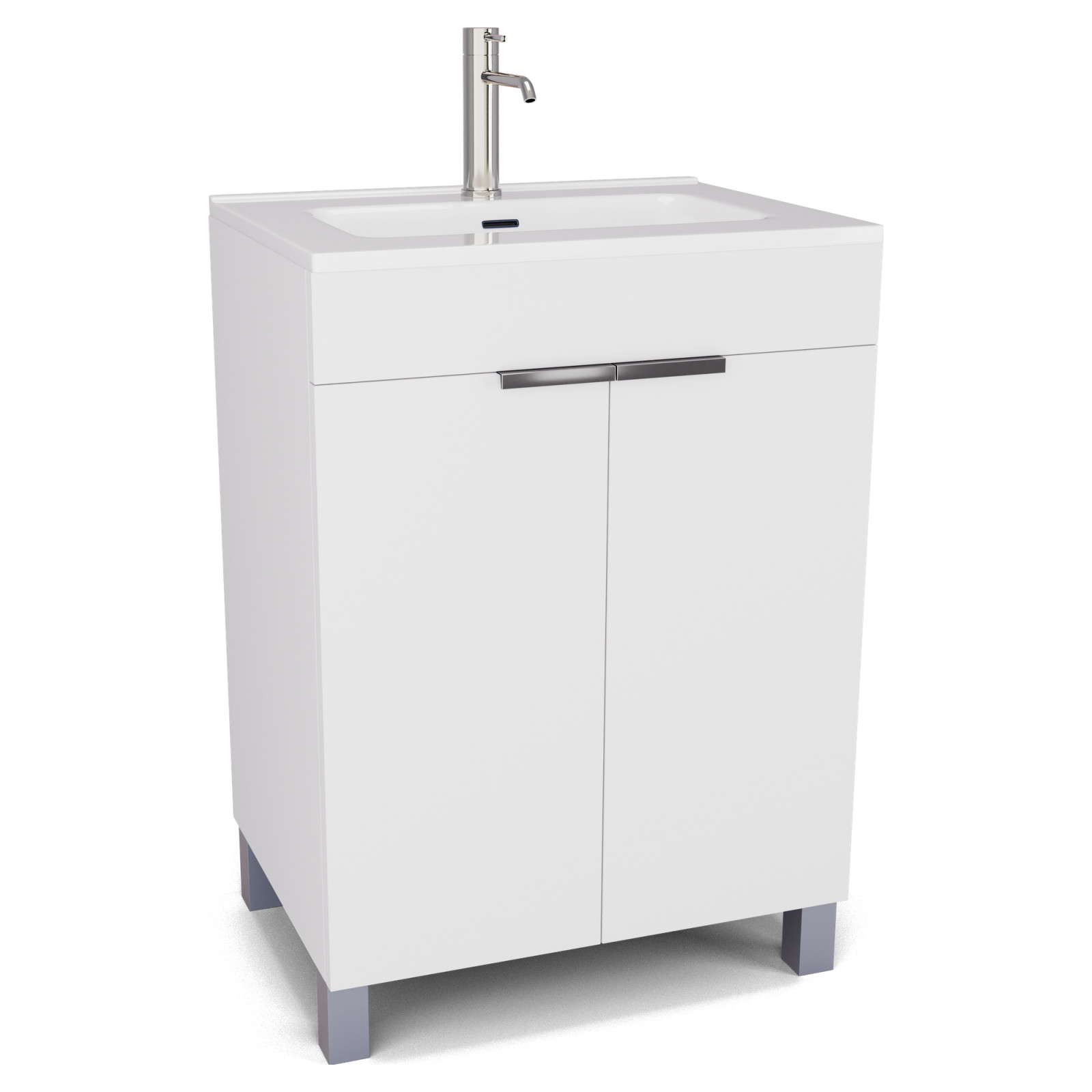Saját márkás 60 cm széles álló mosdószekrény matt fehér színben, fényes króm fogantyúkkal és lábakkal, fényes fehér slim mosdóval, soft-close zsanérokkal ellátva.