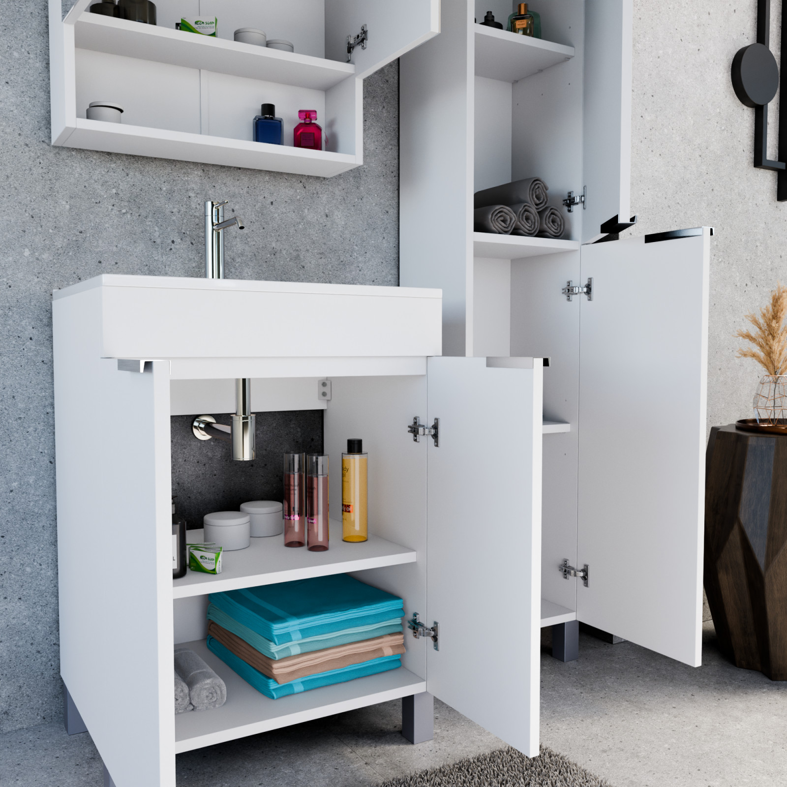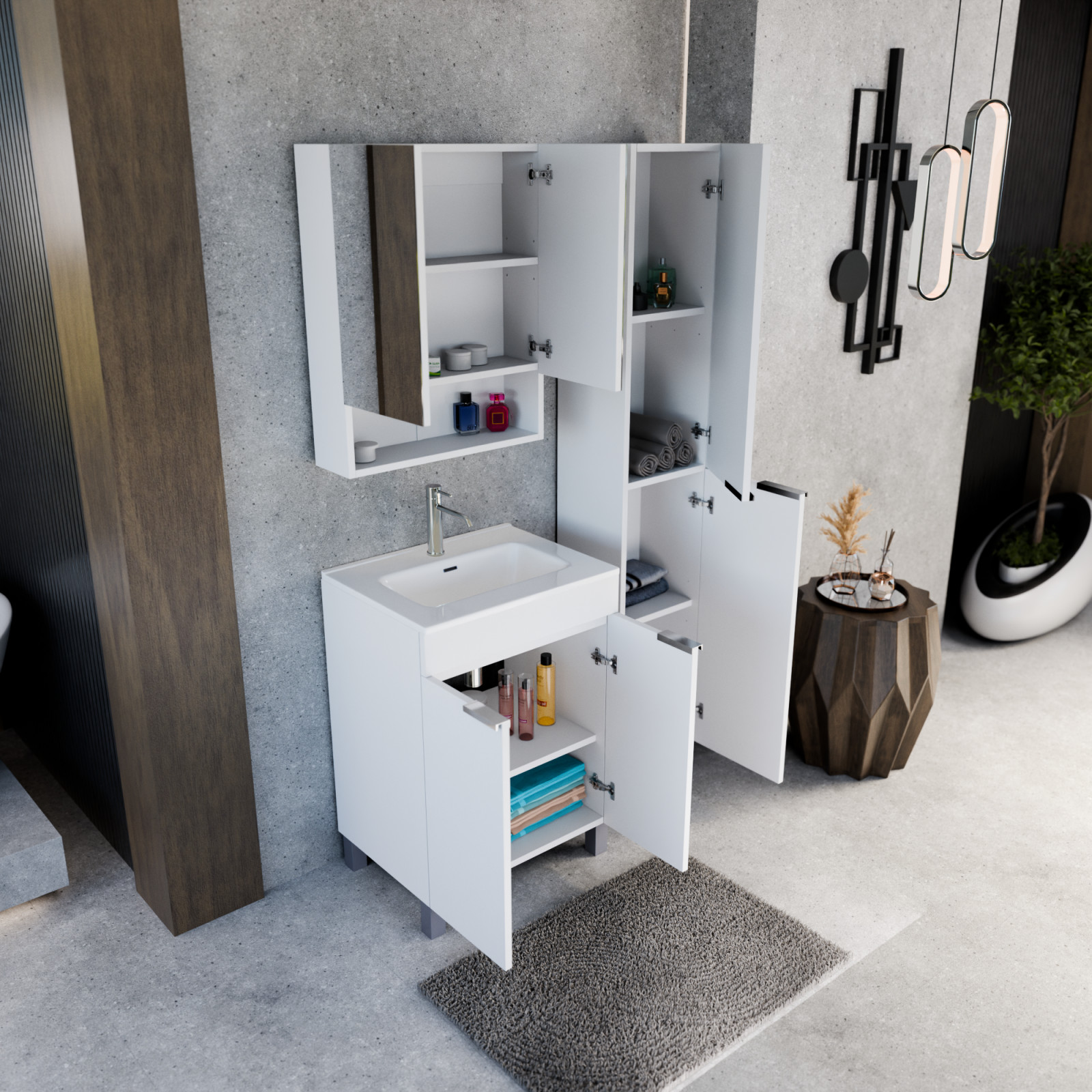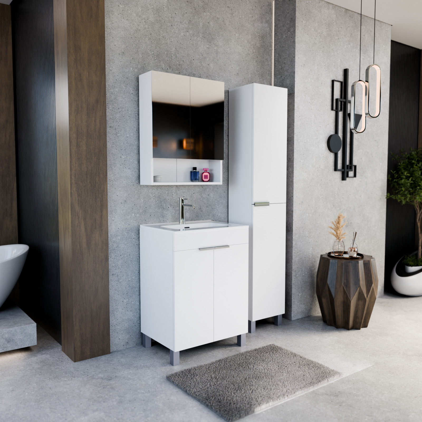 Napjainkban a praktikum mellett a fürdőszoba esztétikus megjelenése is fontos szempont. A lábon álló bútorok egyre elterjedtebbé válnak, mivel számos előnnyel rendelkeznek, ide sorolható a modern, könnyed megjelenés és az egyszerű tisztítás. A lábon álló fürdőszobai bútorok a klasszikus és modernebb stílusú fürdőszobákban is megállják a helyüket egyaránt. Nagyfokú rugalmasság jellemzi őket, mivel szinte bárhol elhelyezhetők a fürdőszobán belül. További előnyük, hogy soft close (csillapítós) zsanérral felszereltek, így  becsukáskor az ajtó vagy fiók finoman záródik be, csökkentve a terhelést és növelve az élettartamot. A szekrény fehér és matt fekete mosdóval, illetve mosdópulttal is szabadon kombinálható ízlés szerint. A teljesség érdekében a mosdószekrényekhez illő tükrös szekrényt és magas szekrényt is választhatunk, hogy a fürdőszobában lévő bútorok egy szemet gyönyörködtető egységet alkossanak.