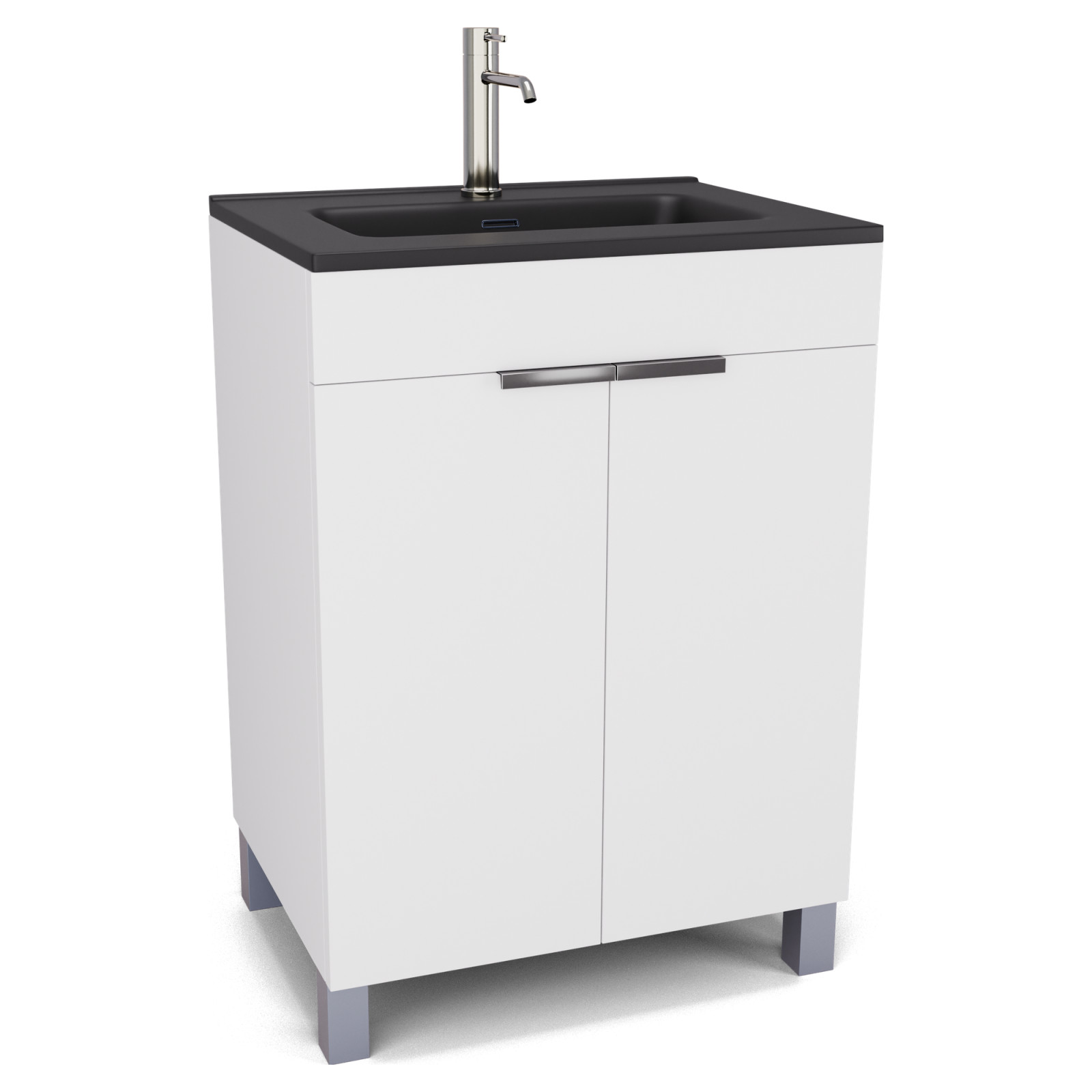 Saját márkás 60 cm széles álló mosdószekrény matt fehér színben, fényes króm fogantyúkkal és lábakkal, fekete slim mosdóval, soft-close zsanérokkal ellátva.