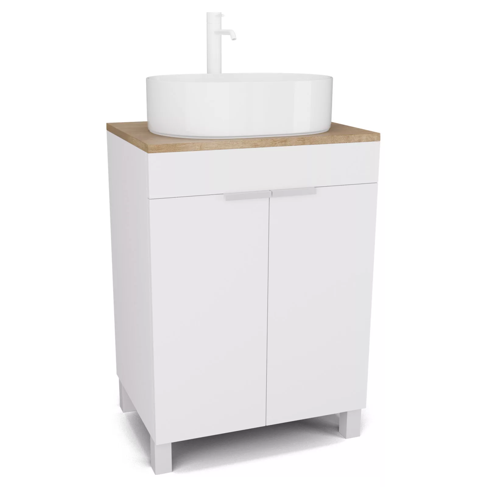 Saját márkás 60 cm széles álló mosdószekrény matt fehér színben, matt fehér fogantyúkkal és lábakkal, tölgyfa színű mosdópulttal, soft-close zsanérokkal ellátva.