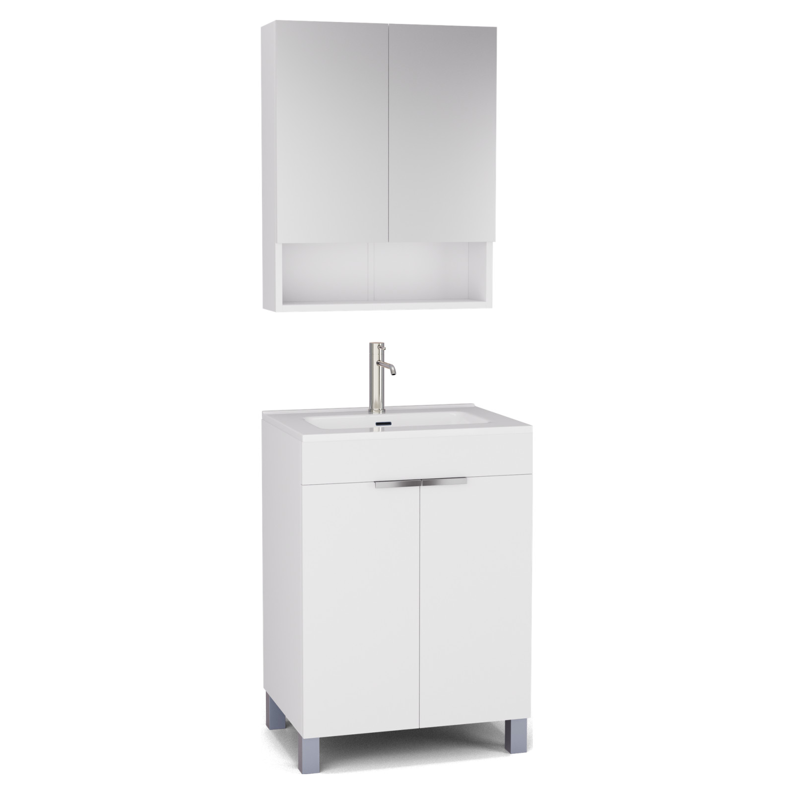 Saját márkás 60 cm széles komplett fürdőszoba bútor álló mosdószekrénnyel matt fehér színben, fényes króm fogantyúkkal és lábakkal, fényes fehér slim mosdóval és fali tükrös szekrénnyel.