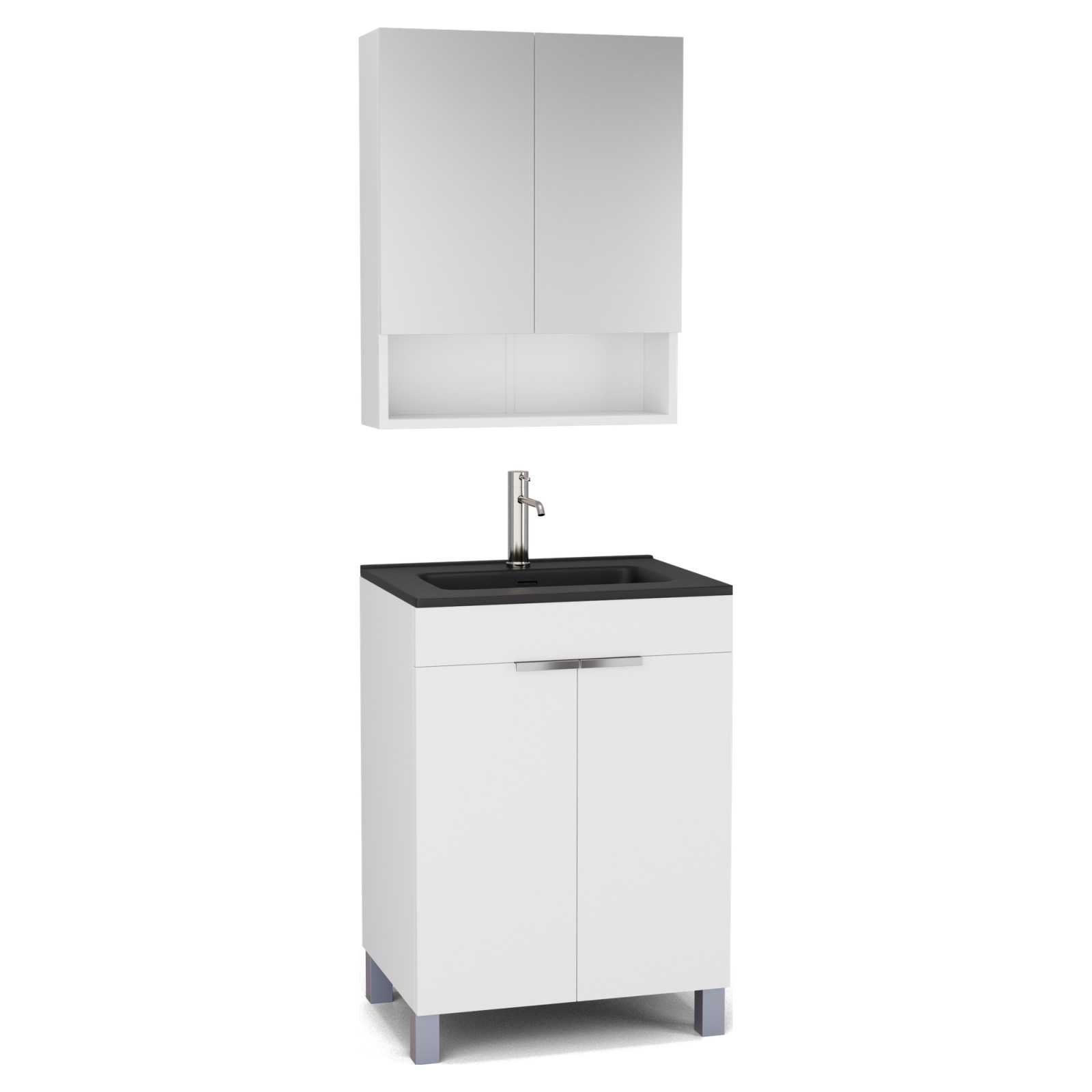 Saját márkás 60 cm széles komplett fürdőszoba bútor álló mosdószekrénnyel matt fehér színben, fényes króm fogantyúkkal és lábakkal, fekete slim mosdóval és fali tükrös szekrénnyel.