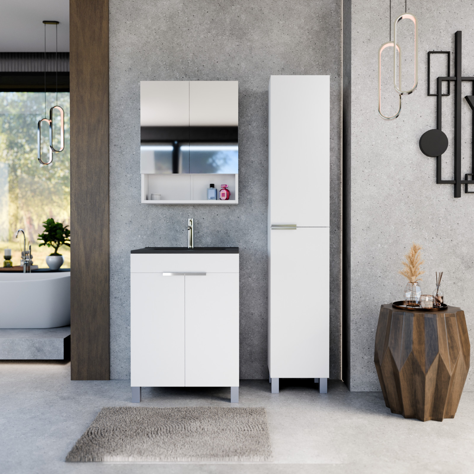 HD Paris Matt White 60 komplett fürdőszoba bútor álló mosdószekrénnyel, fényes króm elemekkel, matt fekete slim mosdóval és tükrös szekrénnyel