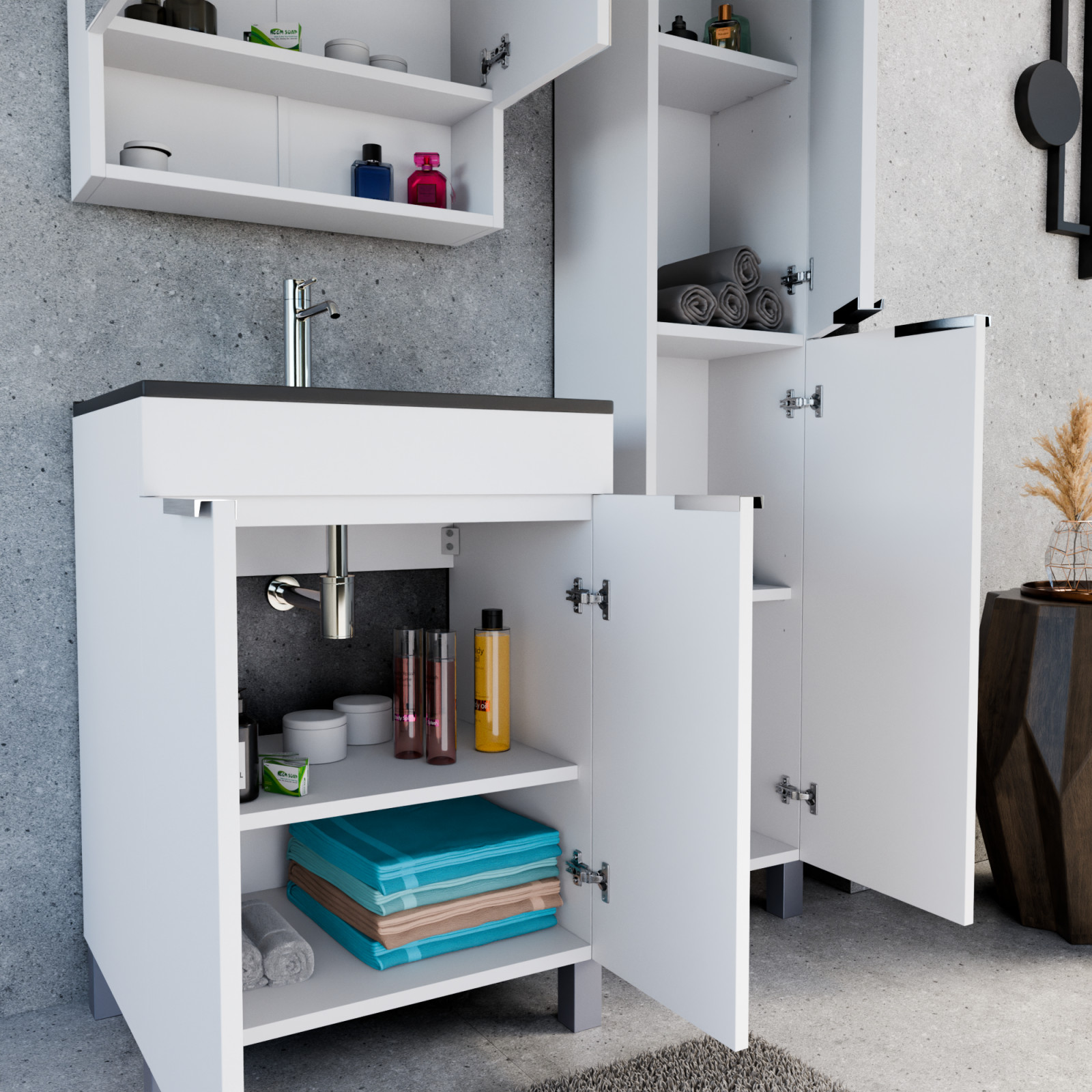 Napjainkban a praktikum mellett a fürdőszoba esztétikus megjelenése is fontos szempont. A lábon álló bútorok egyre elterjedtebbé válnak, mivel számos előnnyel rendelkeznek, ide sorolható a modern, könnyed megjelenés és az egyszerű tisztítás. A lábon álló fürdőszobai bútorok a klasszikus és modernebb stílusú fürdőszobákban is megállják a helyüket egyaránt. Nagyfokú rugalmasság jellemzi őket, mivel szinte bárhol elhelyezhetők a fürdőszobán belül. További előnyük, hogy soft close (csillapítós) zsanérral felszereltek, így  becsukáskor az ajtó vagy fiók finoman záródik be, csökkentve a terhelést és növelve az élettartamot. A szekrény fehér és matt fekete mosdóval, illetve mosdópulttal is szabadon kombinálható ízlés szerint. A teljesség érdekében a mosdószekrényekhez illő tükrös szekrényt és magas szekrényt is választhatunk, hogy a fürdőszobában lévő bútorok egy szemet gyönyörködtető egységet alkossanak.