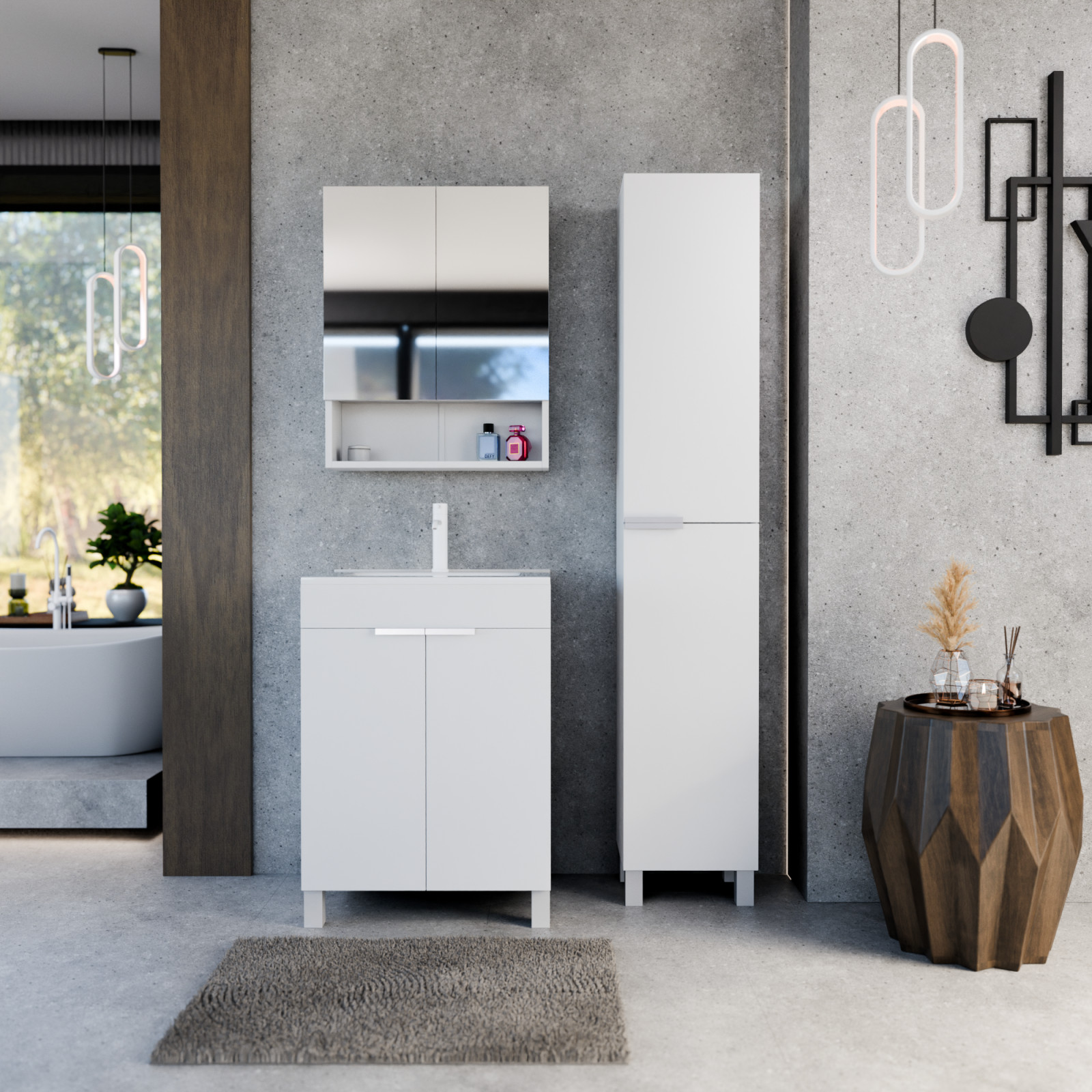 HD Paris Matt White 60 komplett fürdőszoba bútor álló mosdószekrénnyel, matt fehér elemekkel, fényes fehér slim mosdóval és tükrös szekrénnyel