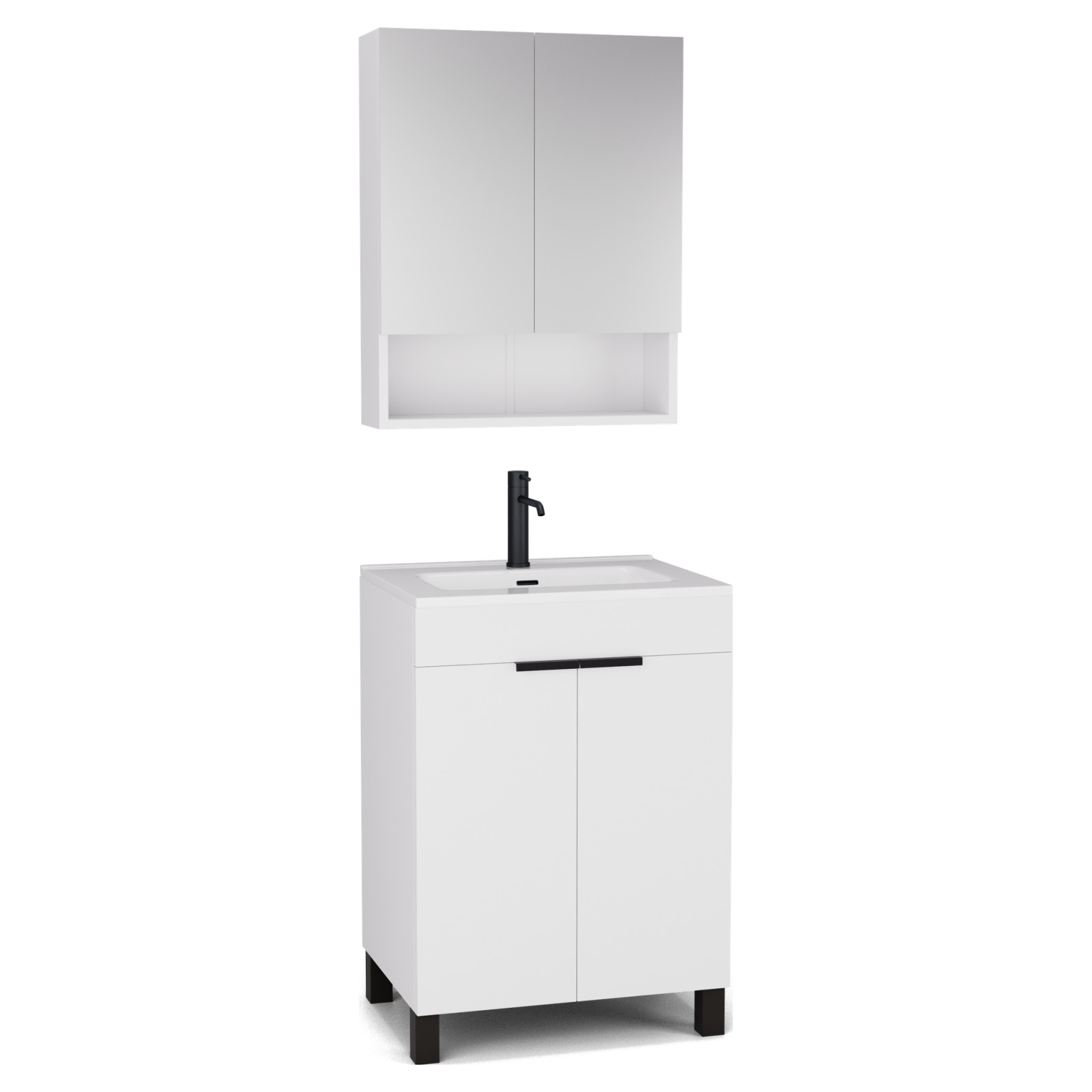 Saját márkás 60 cm széles komplett fürdőszoba bútor álló mosdószekrénnyel matt fehér színben, matt fekete fogantyúkkal és lábakkal, fényes fehér slim mosdóval és fali tükrös szekrénnyel.