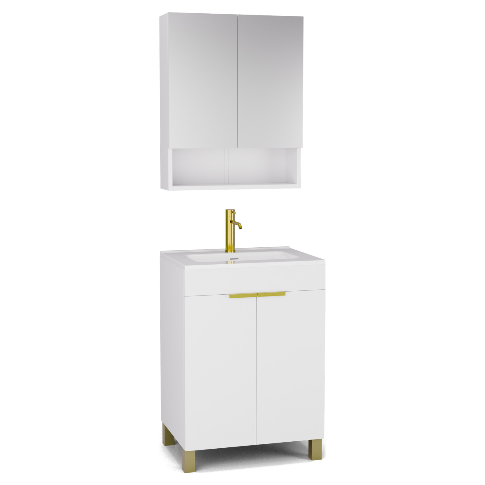 Saját márkás 60 cm széles komplett fürdőszoba bútor álló mosdószekrénnyel matt fehér színben, szálcsiszolt arany fogantyúkkal és lábakkal és fali tükrös szekrénnyel.
