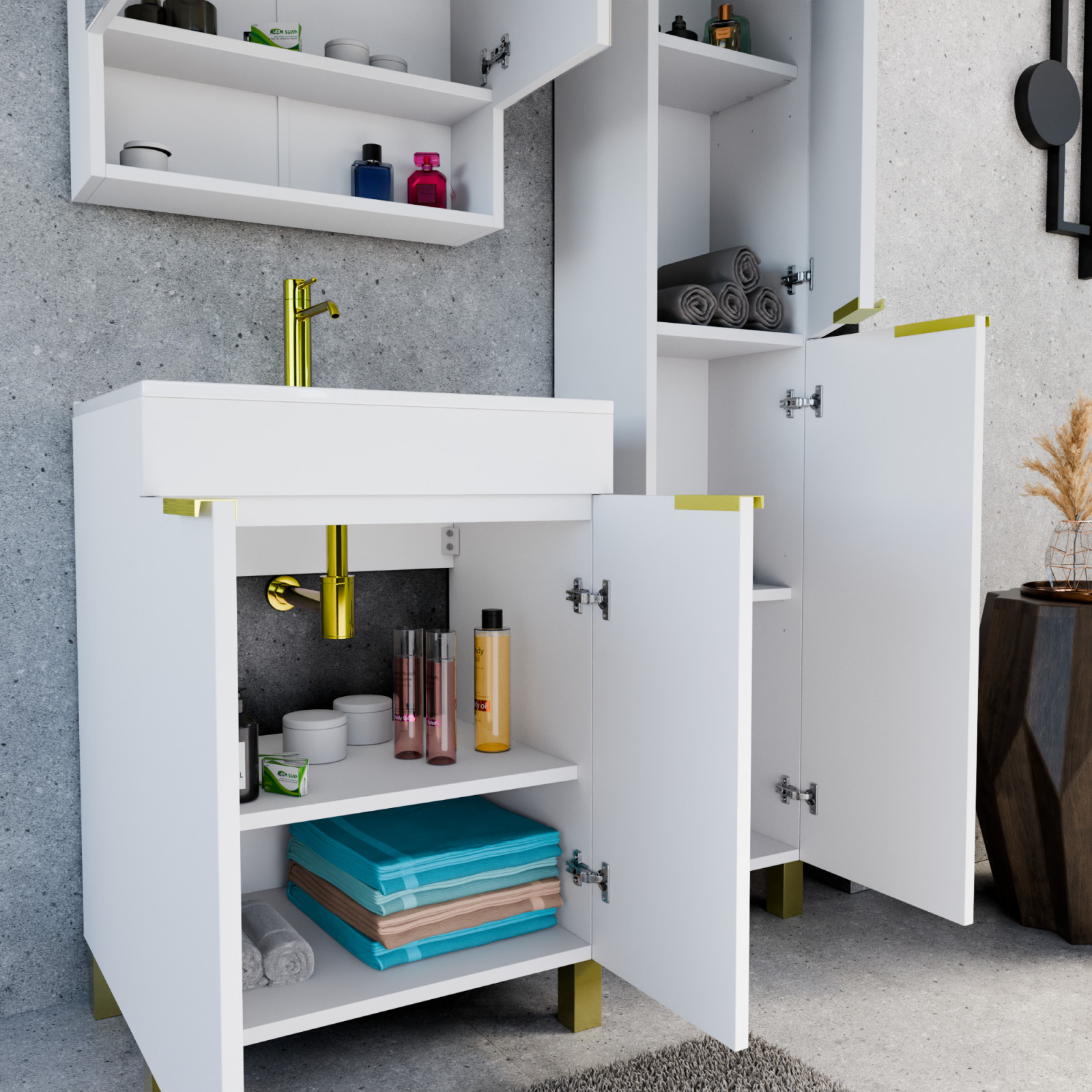 Paris Matt White 60 komplett fürdőszoba bútor, szálcsiszolt arany fogantyúkkal és lábakkal