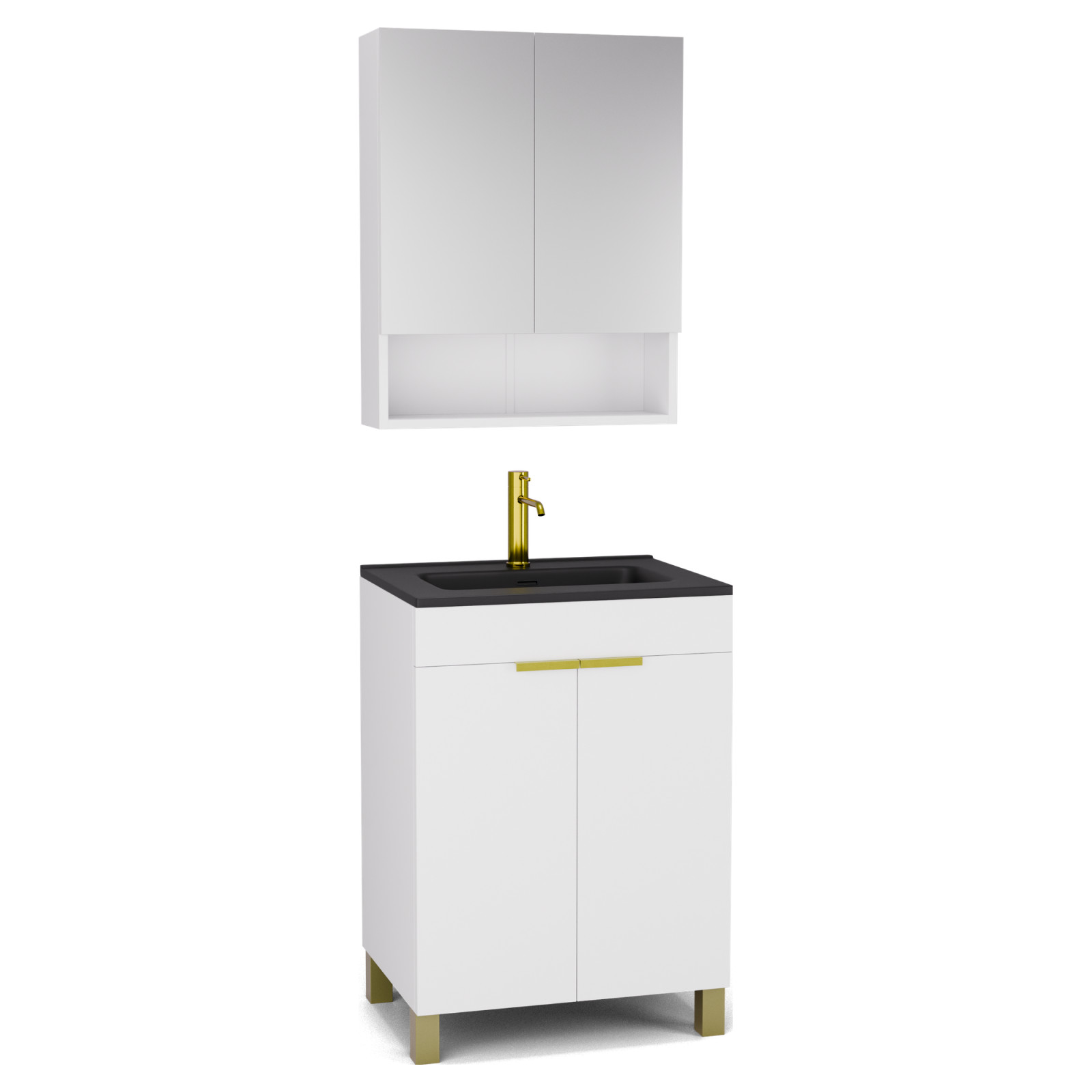 Saját márkás 60 cm széles komplett fürdőszoba bútor álló mosdószekrénnyel matt fehér színben, szálcsiszolt arany fogantyúkkal és lábakkal, fekete slim mosdóval és fali tükrös szekrénnyel.