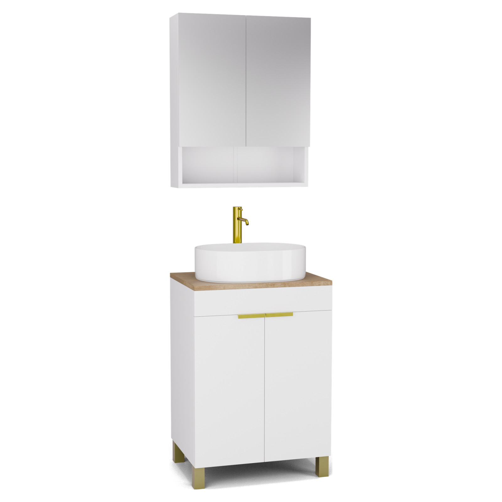 Saját márkás 60 cm széles komplett fürdőszoba bútor álló mosdószekrénnyel matt fehér színben, szálcsiszolt arany fogantyúkkal és lábakkal, tölgyfa színű mosdópulttal és fali tükrös szekrénnyel.