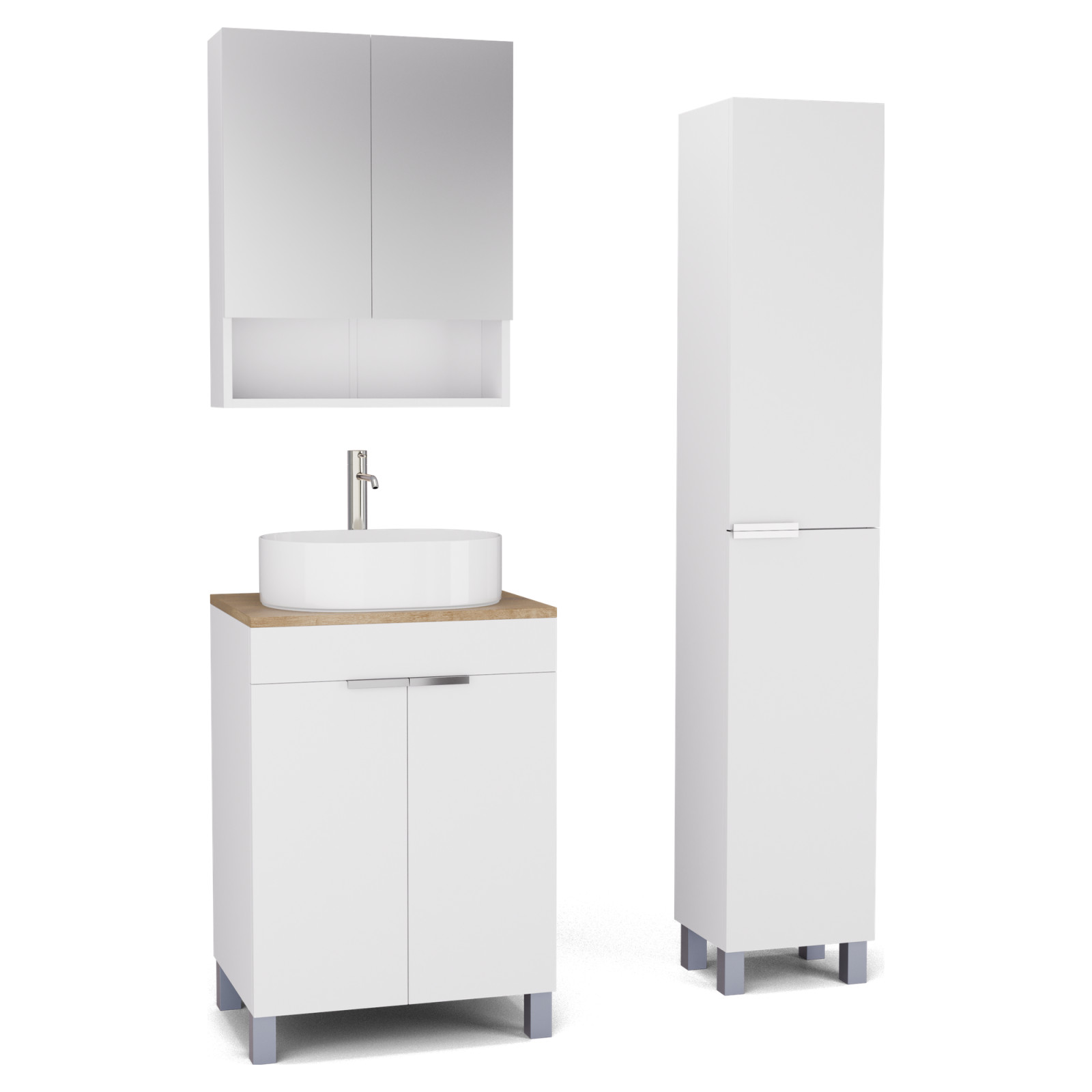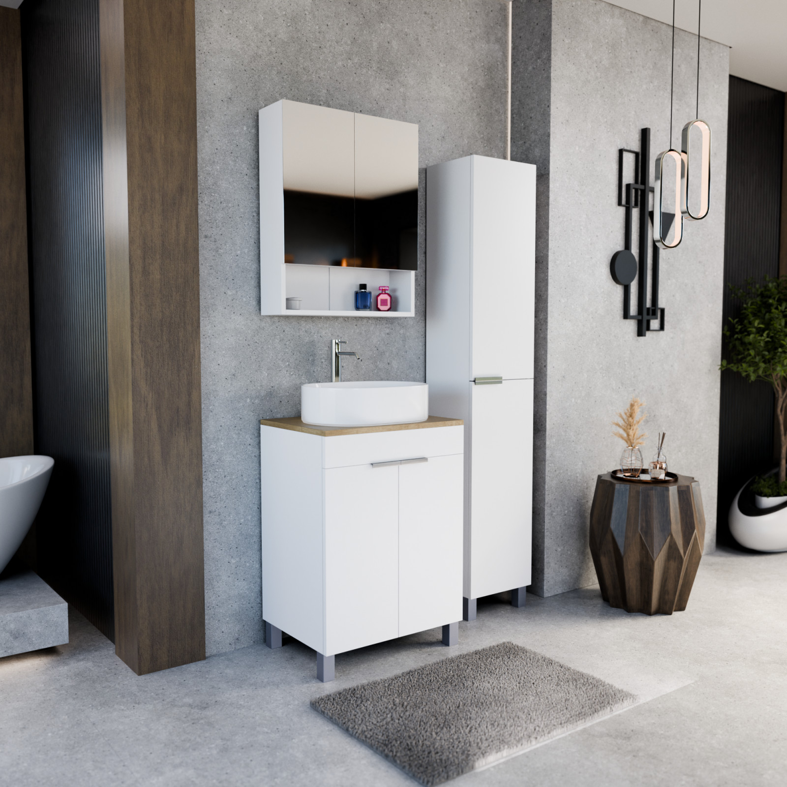 Saját márkás 60 cm széles komplett fürdőszoba bútor álló mosdószekrénnyel matt fehér színben, fényes króm fogantyúkkal és lábakkal, tölgyfa színű mosdópulttal, tükrös szekrénnyel és magasszekrénnyel.