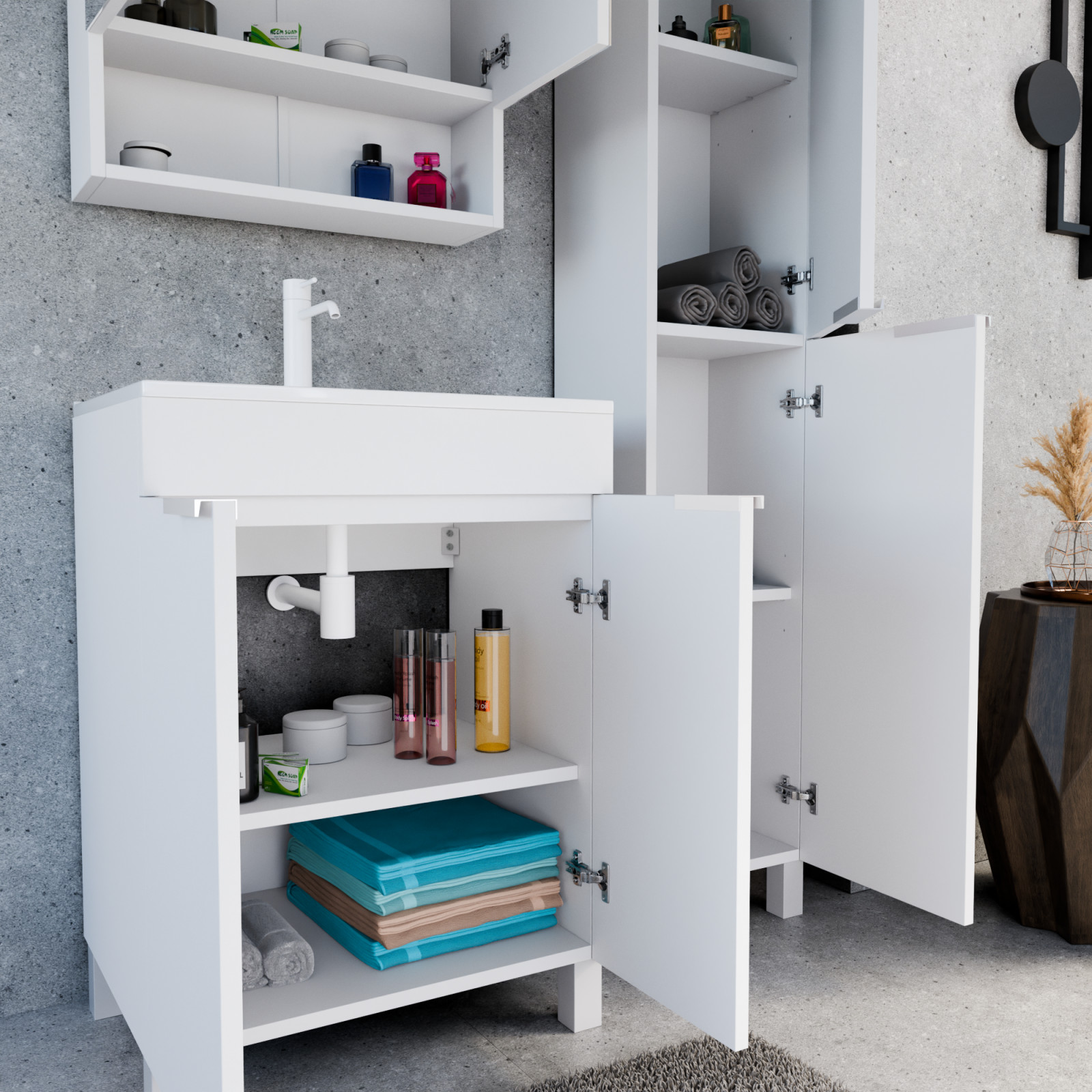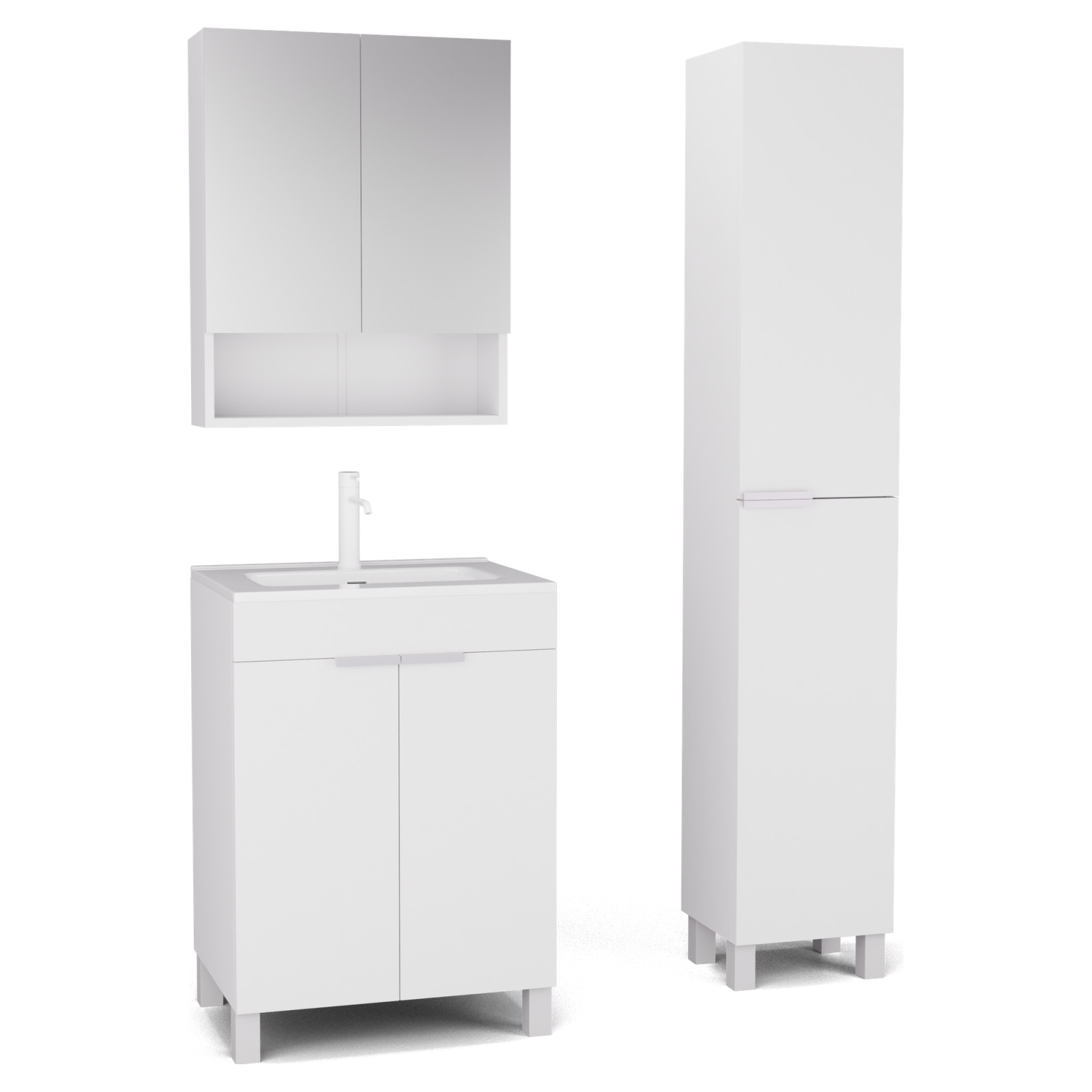 Saját márkás 60 cm széles komplett fürdőszoba bútor álló mosdószekrénnyel matt fehér színben, matt fehér fogantyúkkal és lábakkal, tükrös szekrénnyel és magasszekrénnyel.