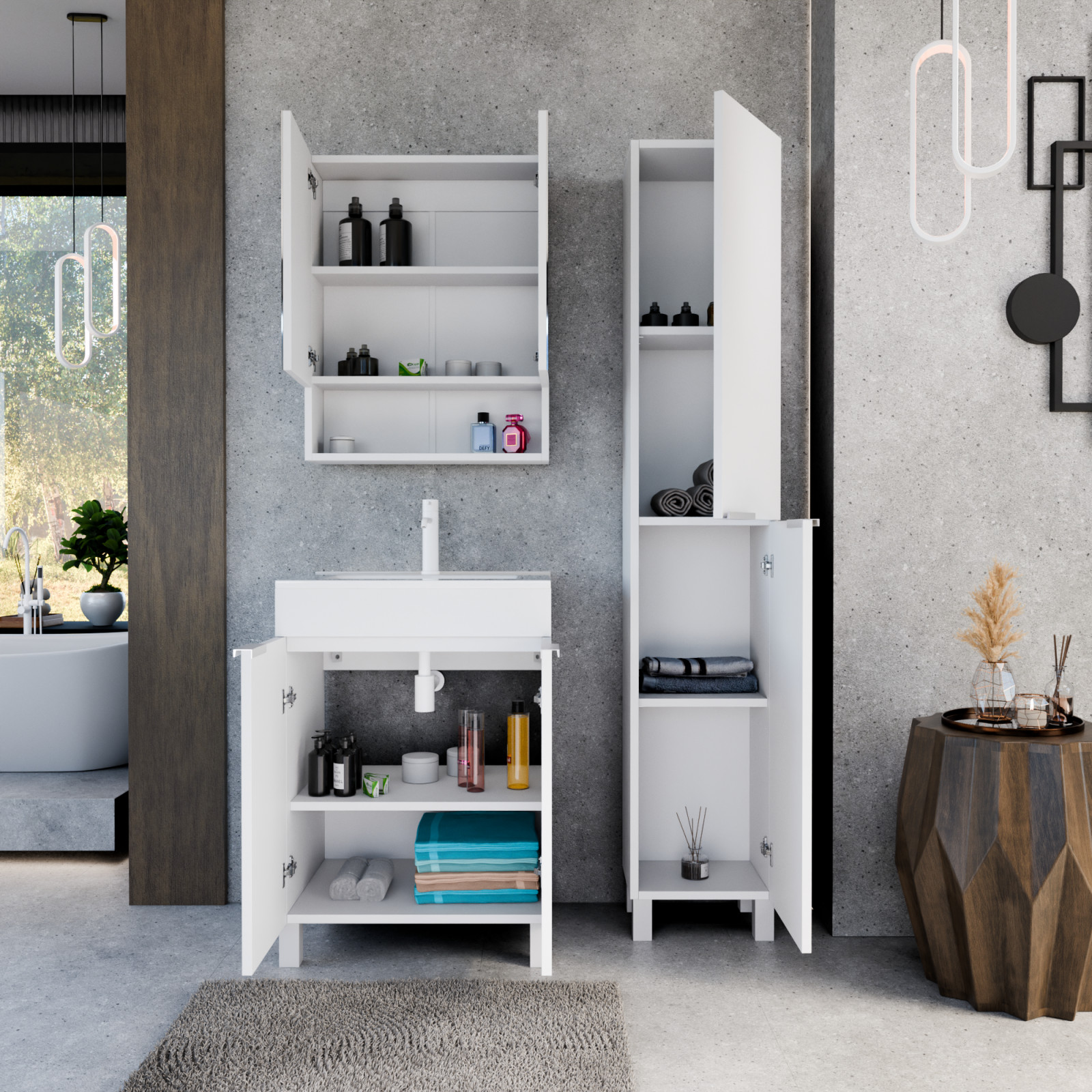 HD Paris Matt White 60 komplett fürdőszoba bútor szett álló mosdószekrénnyel, matt fehér elemekkel, tükrös szekrénnyel és magasszekrénnyel