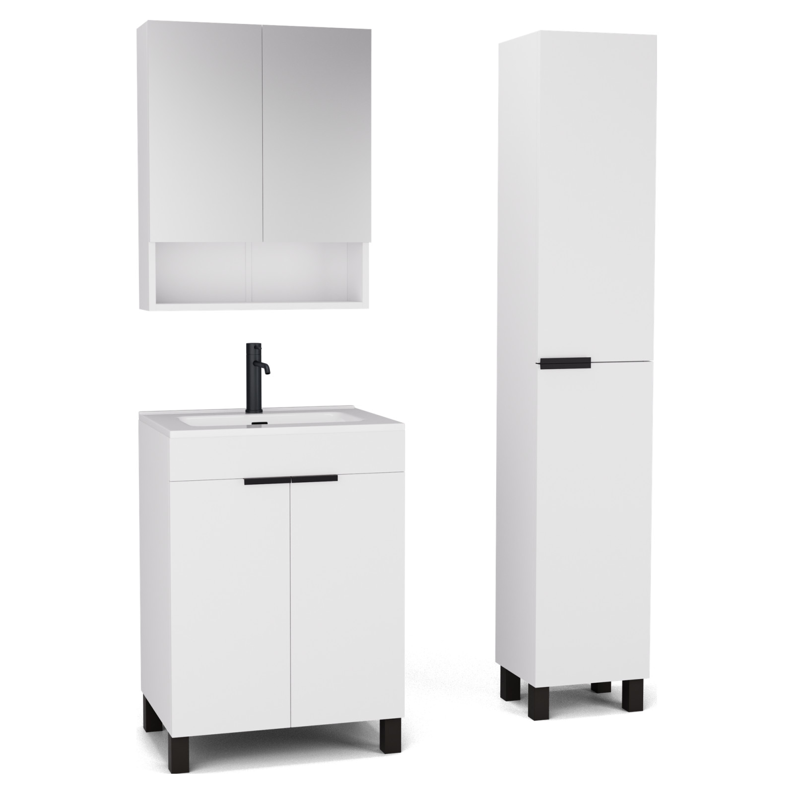 Saját márkás 60 cm széles komplett fürdőszoba bútor álló mosdószekrénnyel matt fehér színben, matt fekete fogantyúkkal és lábakkal, tükrös szekrénnyel és magasszekrénnyel.