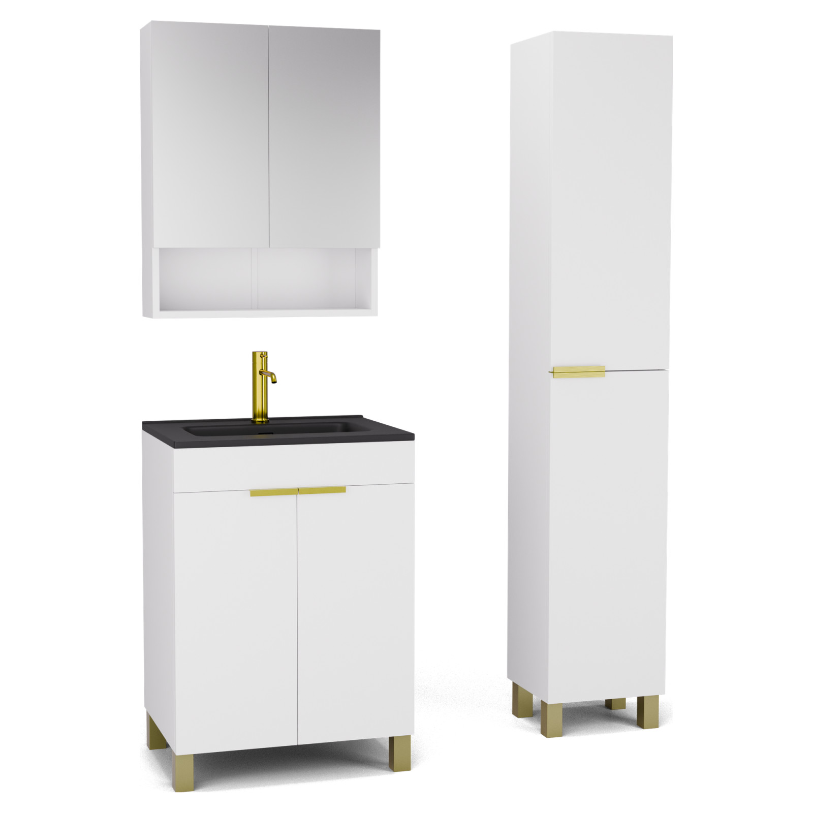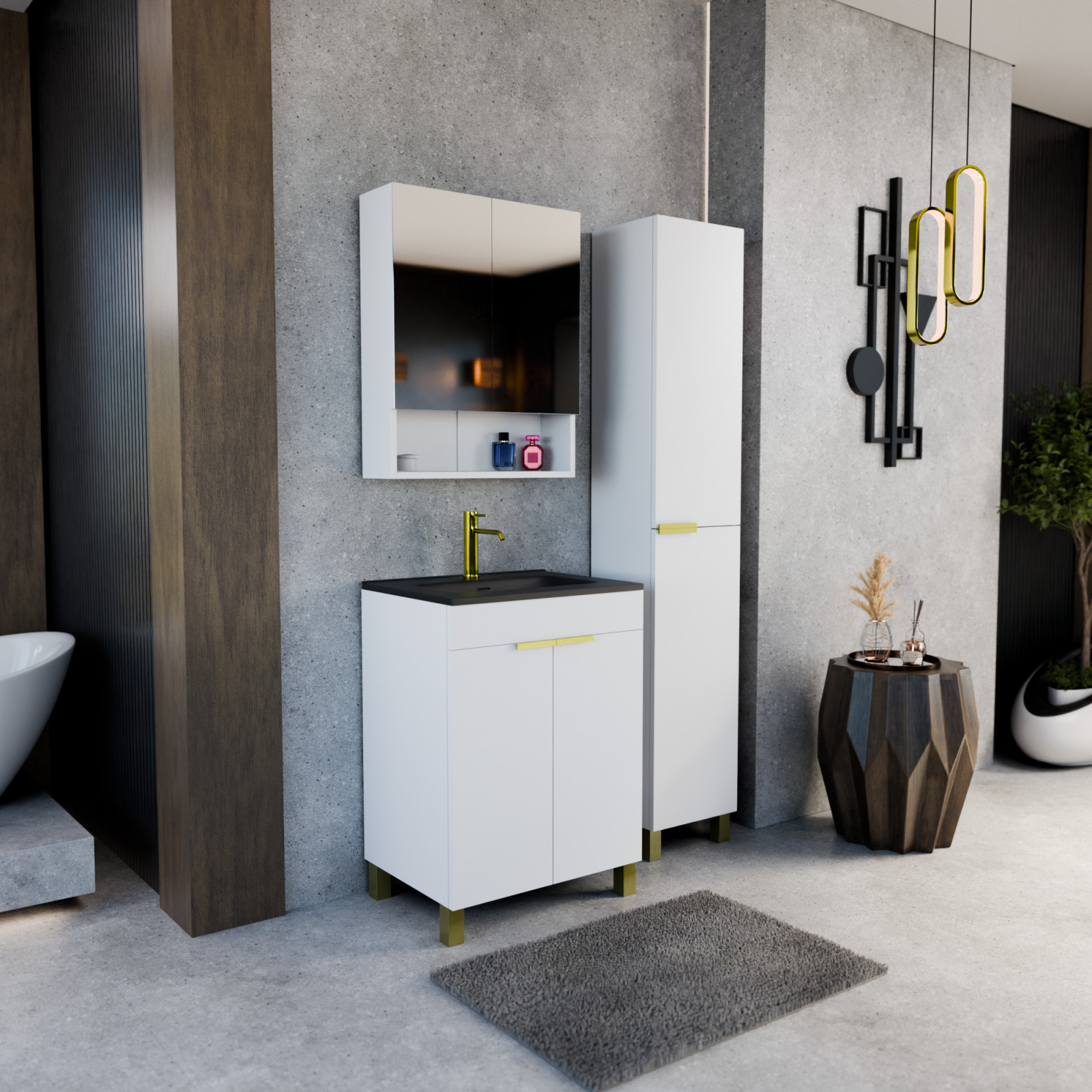 HD Paris Matt White 60 komplett fürdőszoba bútor szett álló mosdószekrénnyel, szálcsiszolt arany elemekkel, matt fekete slim mosdóval, tükrös szekrénnyel és magasszekrénnyel