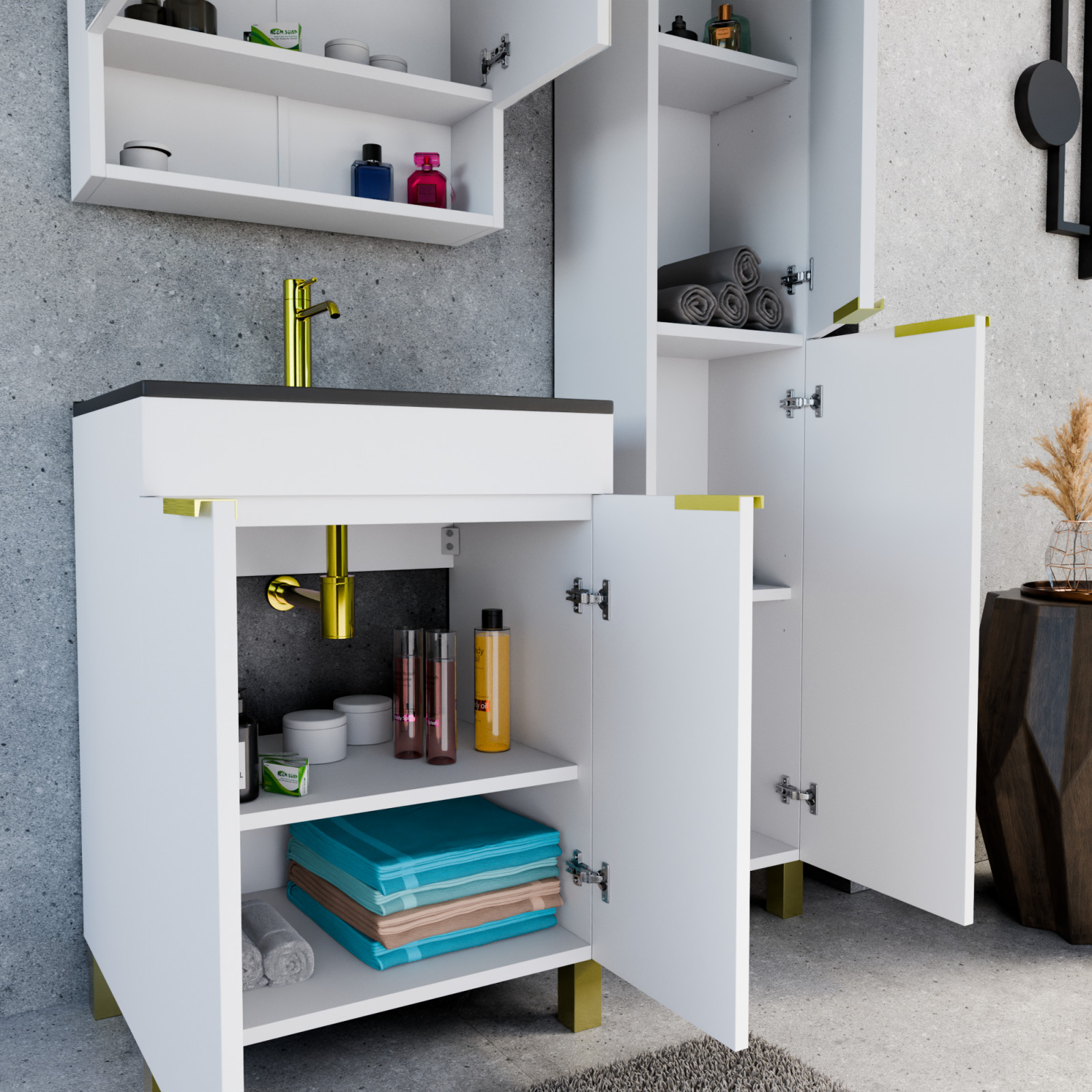 Saját márkás 60 cm széles komplett fürdőszoba bútor álló mosdószekrénnyel matt fehér színben, szálcsiszolt arany fogantyúkkal és lábakkal, tükrös szekrénnyel és magasszekrénnyel.