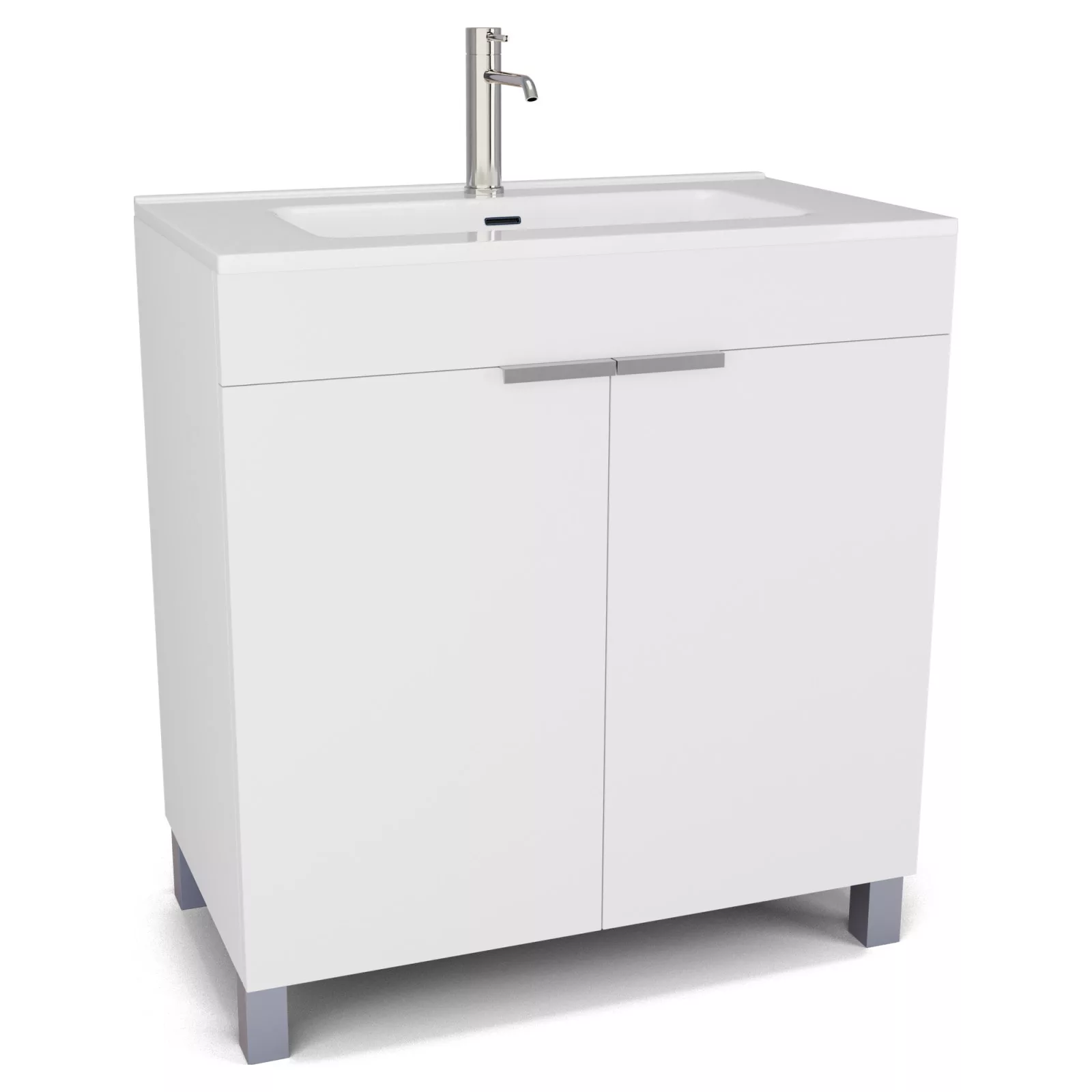 Saját márkás 80 cm széles álló mosdószekrény matt fehér színben, szálcsiszolt króm fogantyúkkal és lábakkal, soft-close zsanérokkal ellátva.
