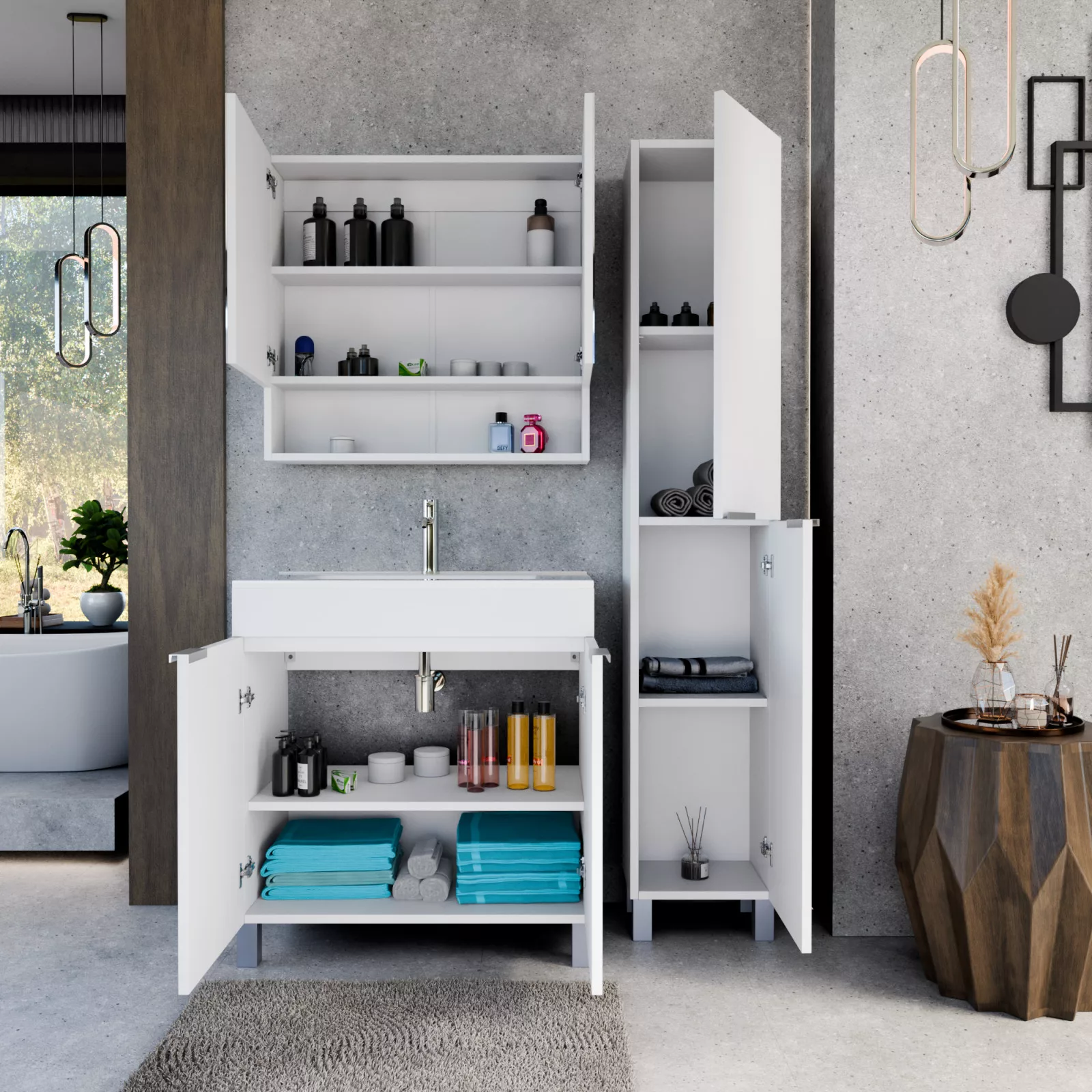 Napjainkban a praktikum mellett a fürdőszoba esztétikus megjelenése is fontos szempont. A lábon álló bútorok egyre elterjedtebbé válnak, mivel számos előnnyel rendelkeznek, ide sorolható a modern, könnyed megjelenés és az egyszerű tisztítás. A lábon álló fürdőszobai bútorok a klasszikus és modernebb stílusú fürdőszobákban is megállják a helyüket egyaránt. Nagyfokú rugalmasság jellemzi őket, mivel szinte bárhol elhelyezhetők a fürdőszobán belül. További előnyük, hogy soft close (csillapítós) zsanérral felszereltek, így  becsukáskor az ajtó vagy fiók finoman záródik be, csökkentve a terhelést és növelve az élettartamot. A szekrény fehér és matt fekete mosdóval, illetve mosdópulttal is szabadon kombinálható ízlés szerint. A teljesség érdekében a mosdószekrényekhez illő tükrös szekrényt és magas szekrényt is választhatunk, hogy a fürdőszobában lévő bútorok egy szemet gyönyörködtető egységet alkossanak.