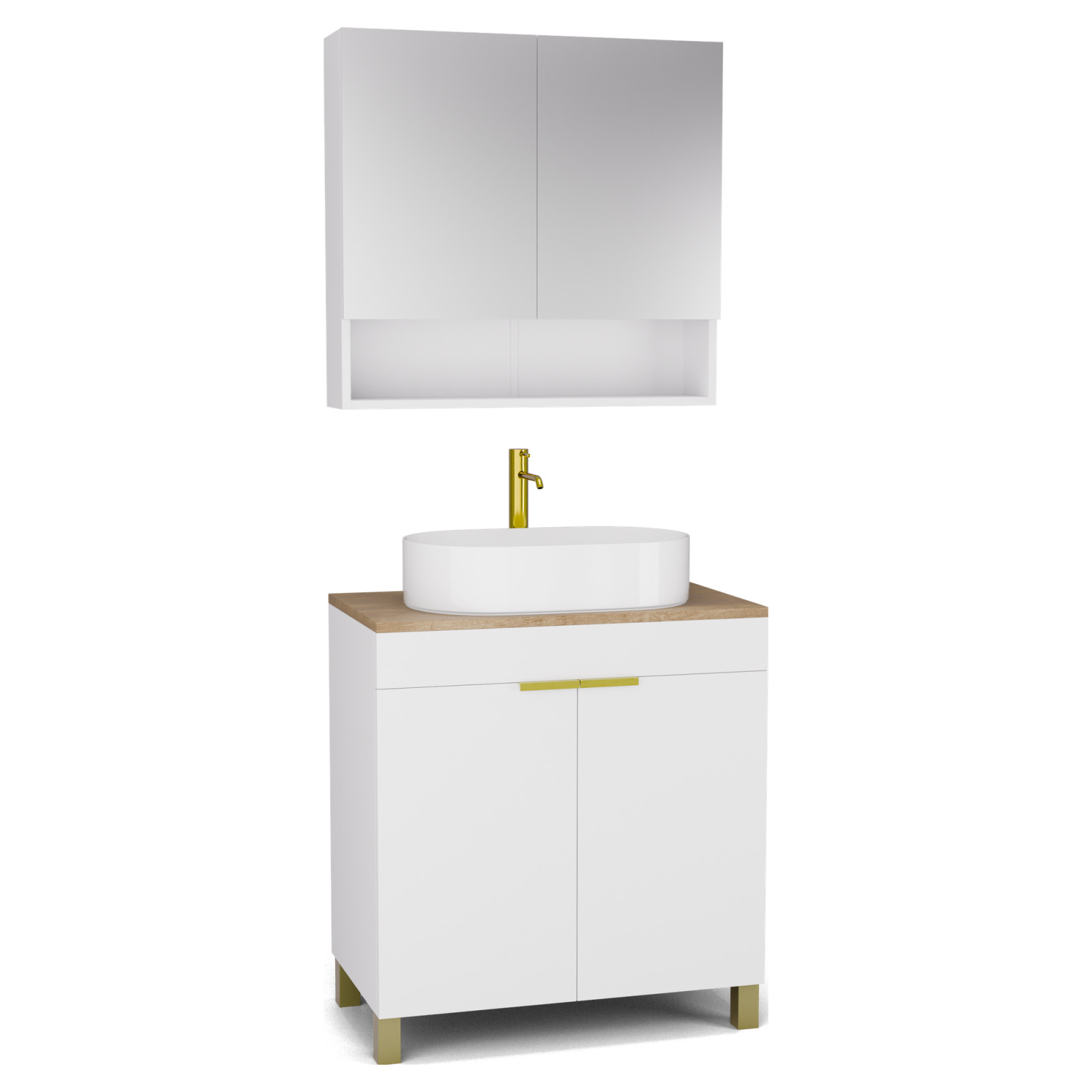 Saját márkás 80 cm széles komplett fürdőszoba bútor álló mosdószekrénnyel matt fehér színben, szálcsiszolt arany fogantyúkkal és lábakkal, tölgyfa színű mosdópulttal és fali tükrös szekrénnyel.