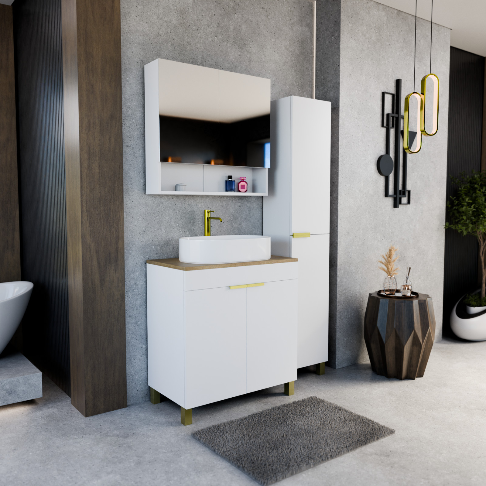 HD Paris Matt White 80 komplett fürdőszoba bútor álló mosdószekrénnyel, szálcsiszolt arany elemekkel, tölgyfa színű mosdópulttal és tükrös szekrénnyel
