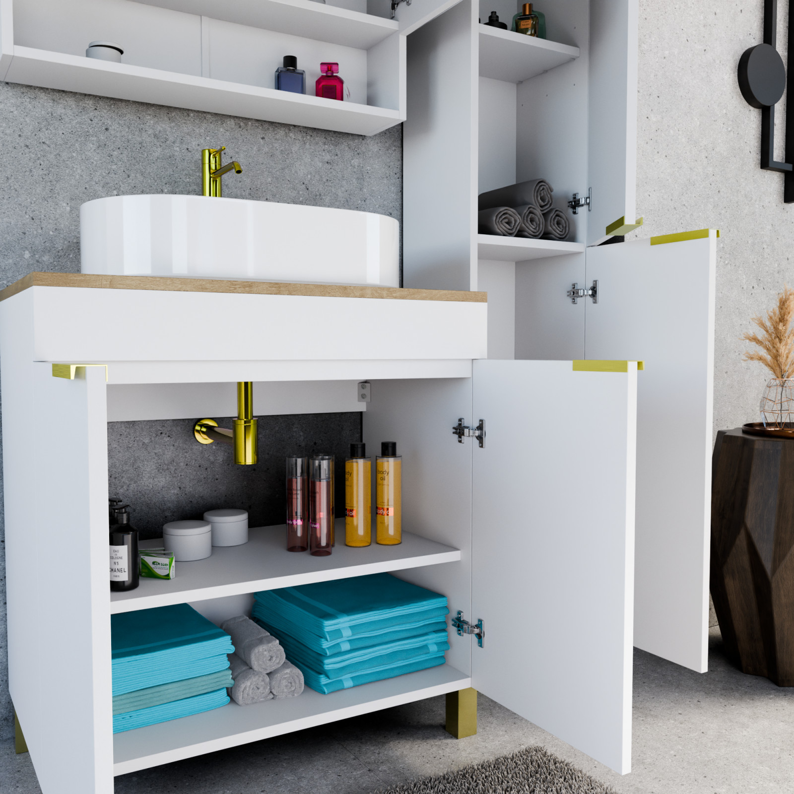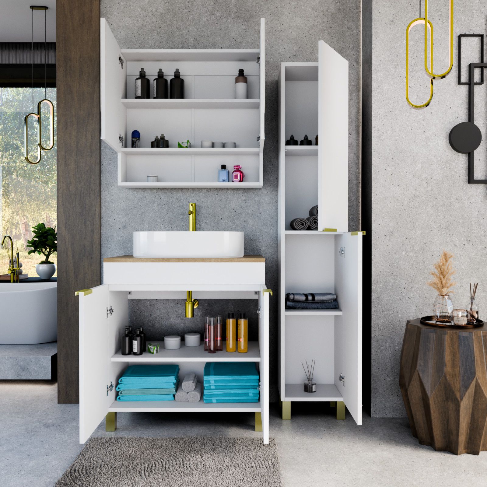 Paris Matt White 80 komplett fürdőszoba bútor, szálcsiszolt arany fogantyúkkal és lábakkal