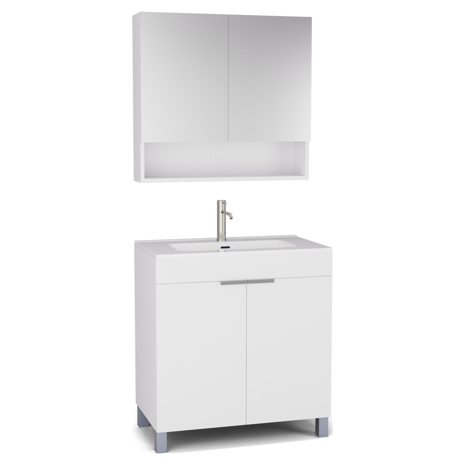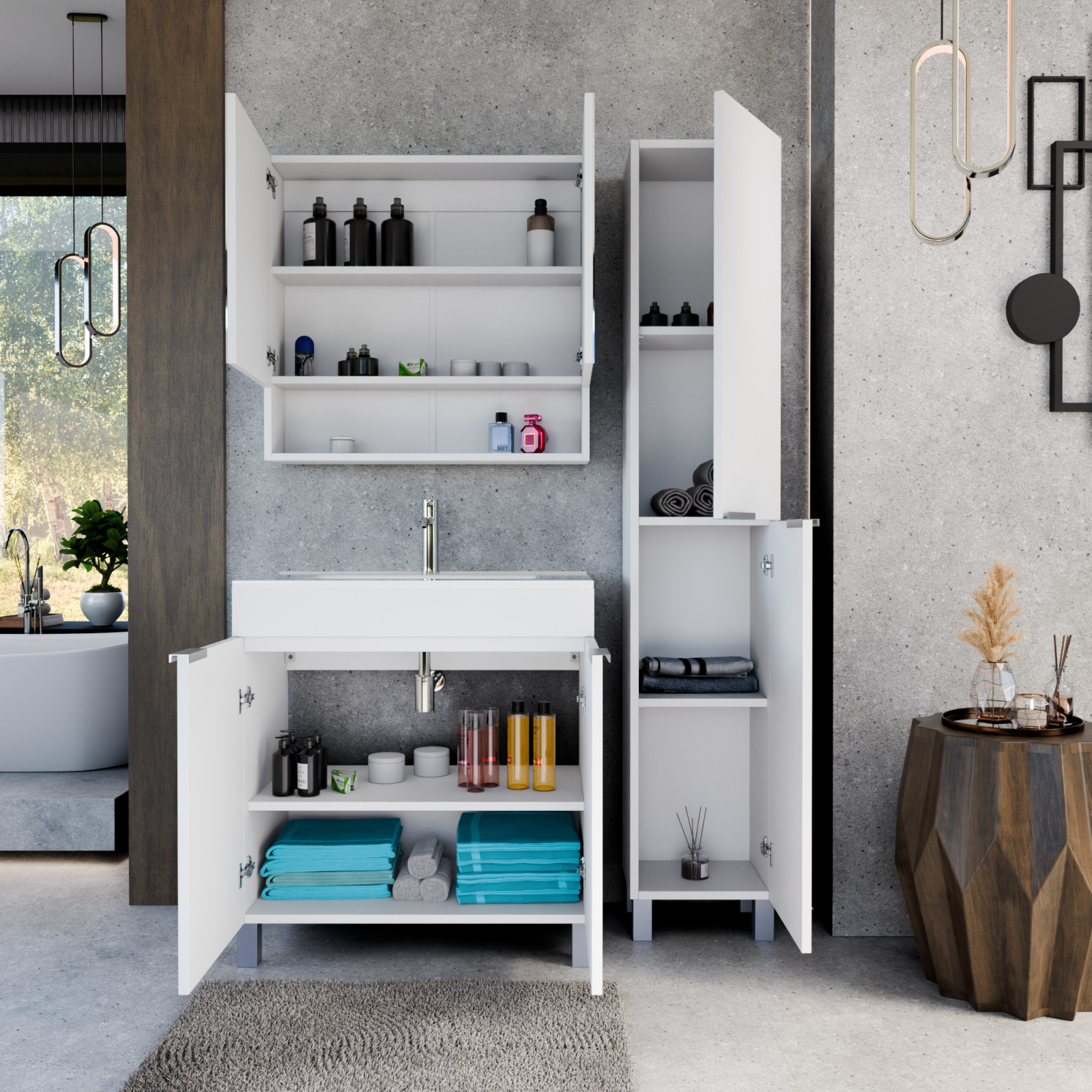 Saját márkás 80 cm széles komplett fürdőszoba bútor álló mosdószekrénnyel matt fehér színben, szálcsiszolt króm fogantyúkkal és lábakkal és fali tükrös szekrénnyel.