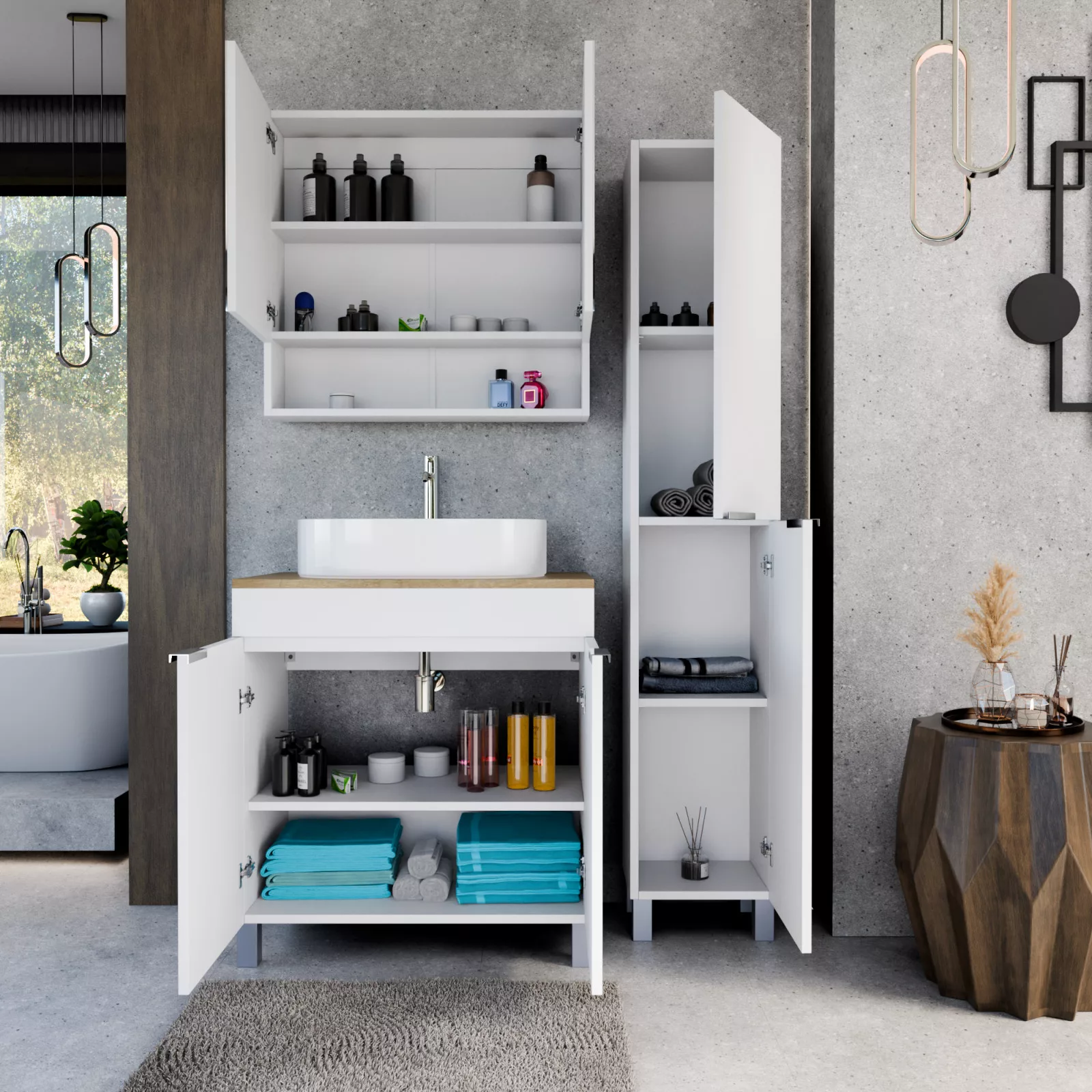 • Szett tartalma: Mosdószekrény mosdópulttal (A mosdókagyló és a csaptelep nem tartozék!), tükrös szekrény, magasszekrény
