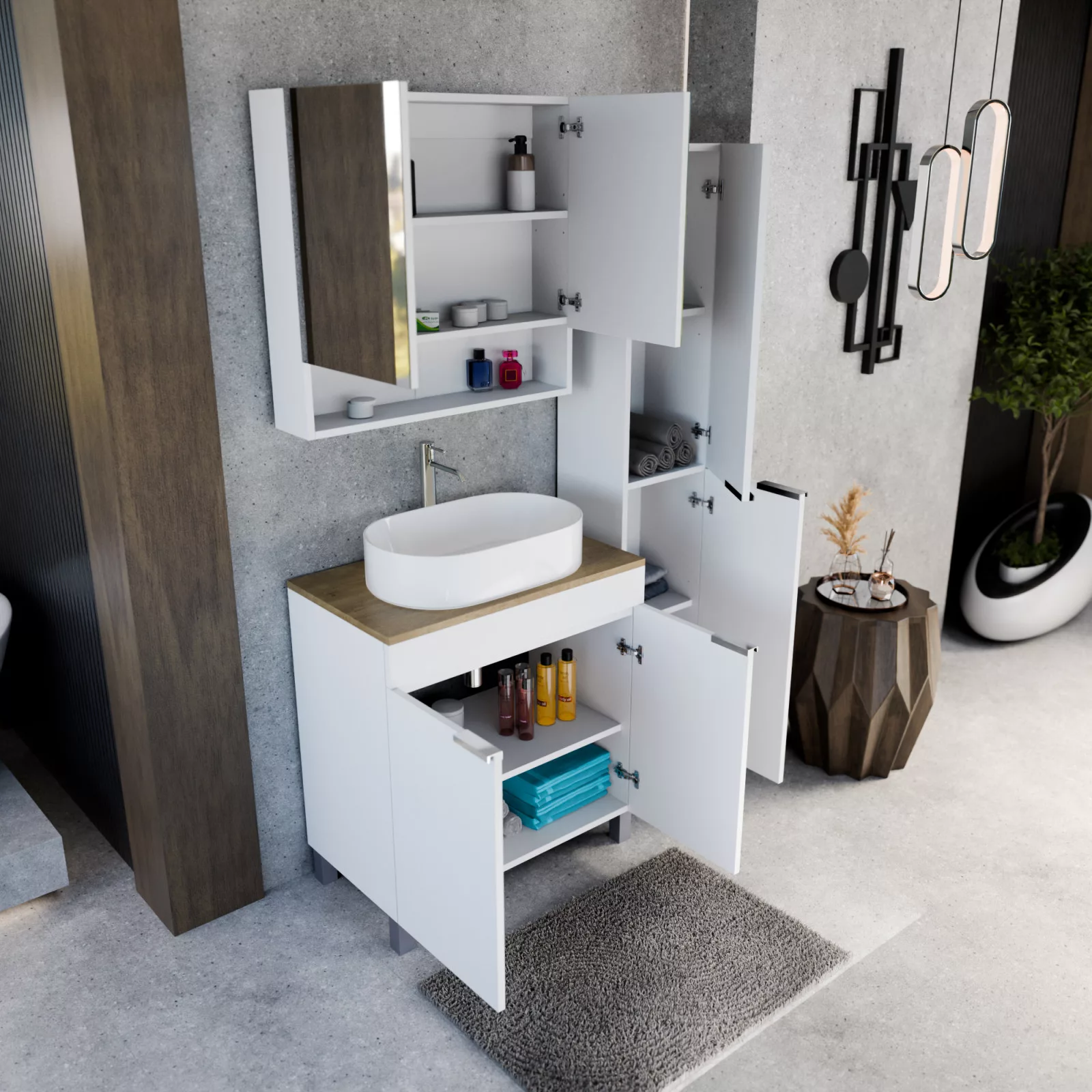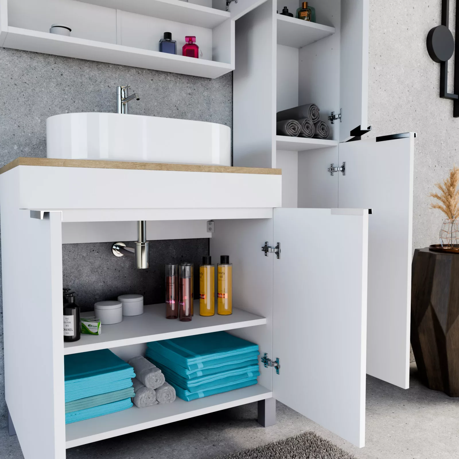 Saját márkás 80 cm széles komplett fürdőszoba bútor álló mosdószekrénnyel matt fehér színben, fényes króm fogantyúkkal és lábakkal, tölgyfa színű mosdópulttal, tükrös szekrénnyel és magasszekrénnyel.