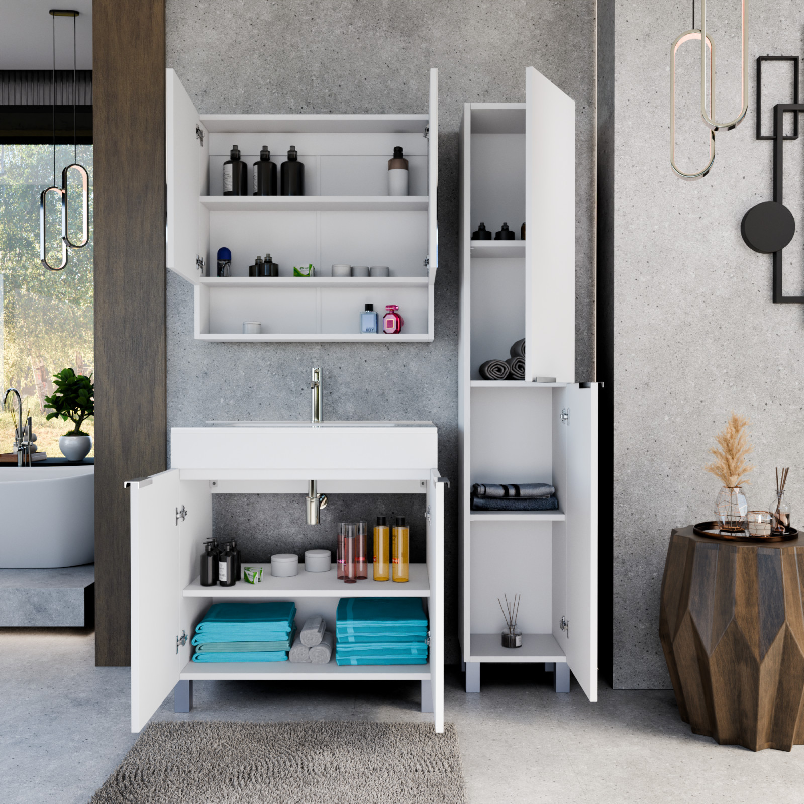 HD Paris Matt White 80 komplett fürdőszoba bútor szett álló mosdószekrénnyel, fényes króm elemekkel, tükrös szekrénnyel és magasszekrénnyel