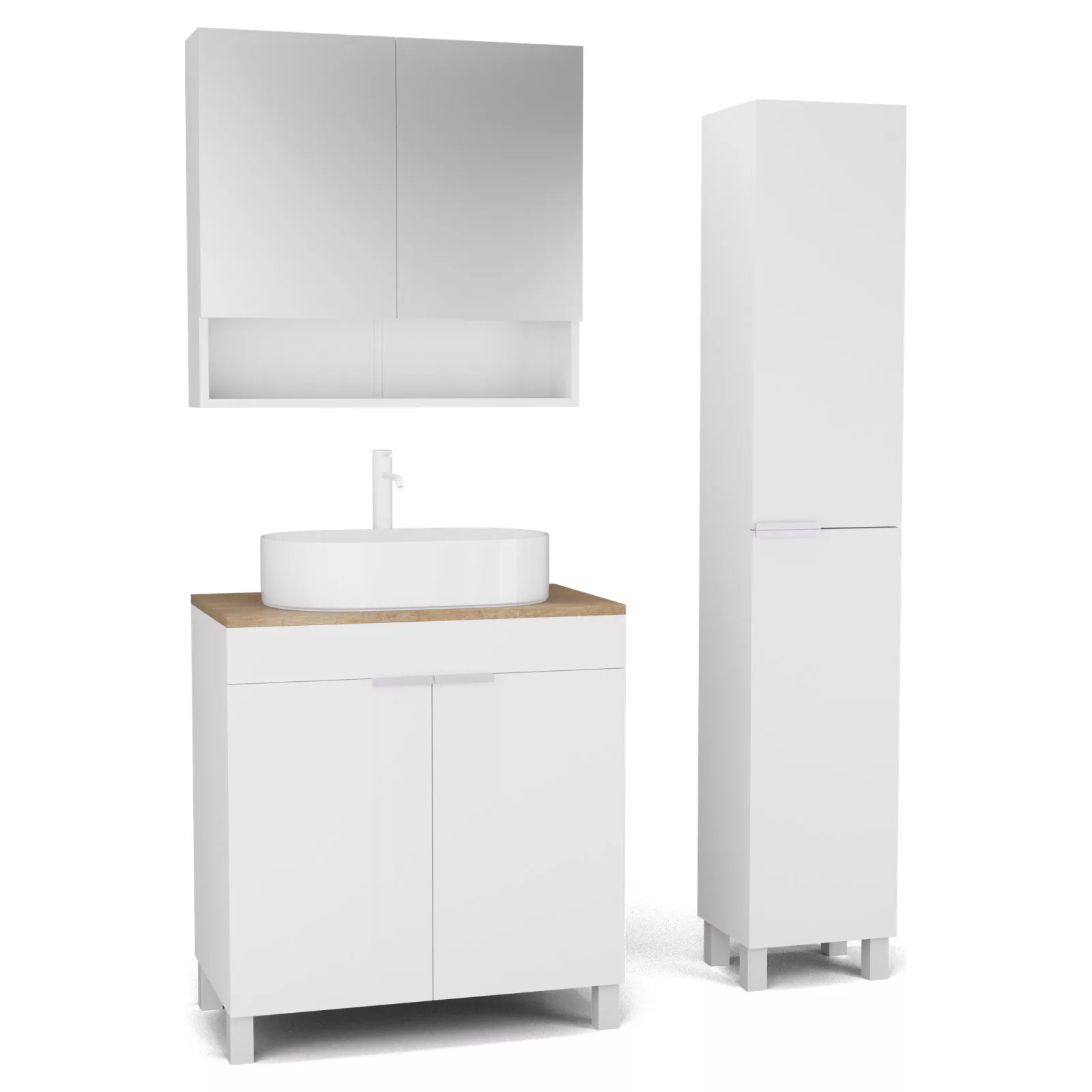 Saját márkás 80 cm széles komplett fürdőszoba bútor álló mosdószekrénnyel matt fehér színben, matt fehér fogantyúkkal és lábakkal, tölgyfa színű mosdópulttal, tükrös szekrénnyel és magasszekrénnyel.