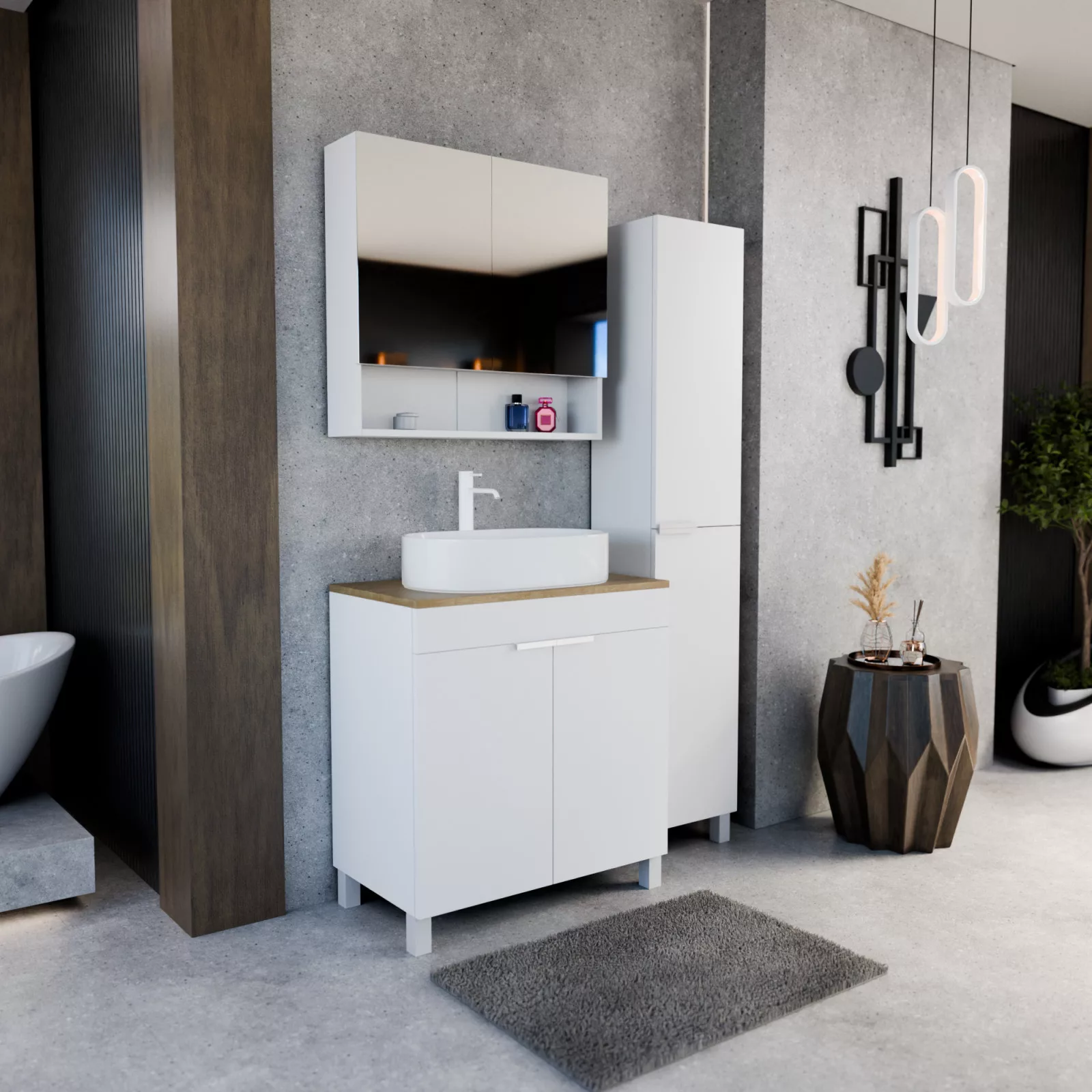 HD Paris Matt White 80 komplett fürdőszoba bútor szett álló mosdószekrénnyel, matt fehér elemekkel, tölgyfa színű mosdópulttal, tükrös szekrénnyel és magasszekrénnyel