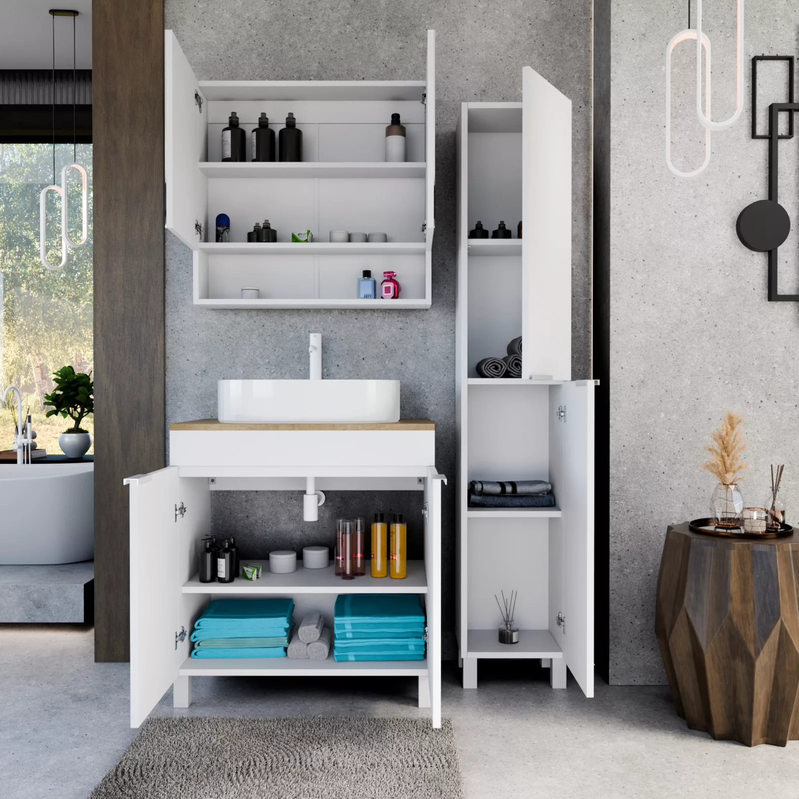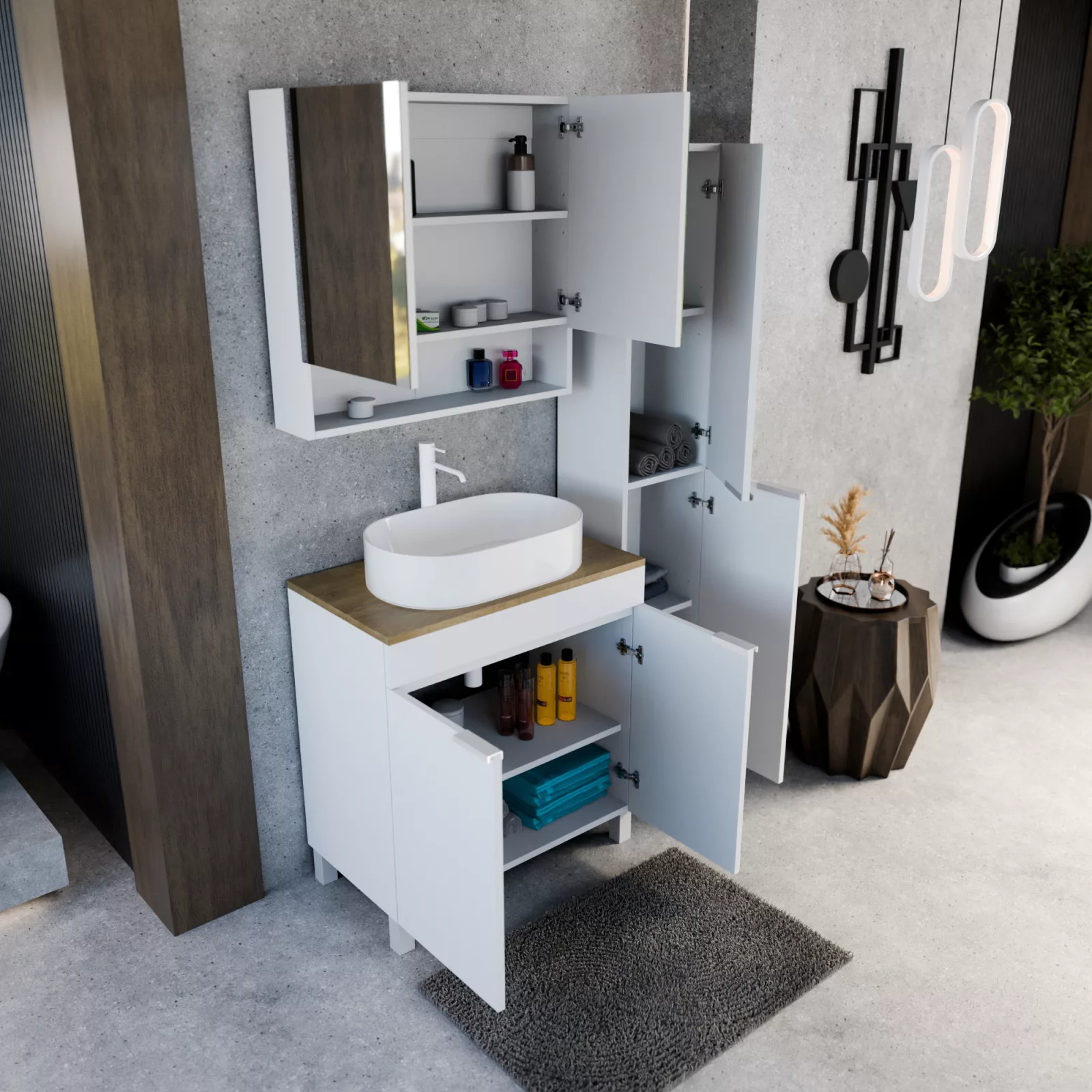 • Szett tartalma: Mosdószekrény mosdópulttal (A mosdókagyló és a csaptelep nem tartozék!), tükrös szekrény, magasszekrény