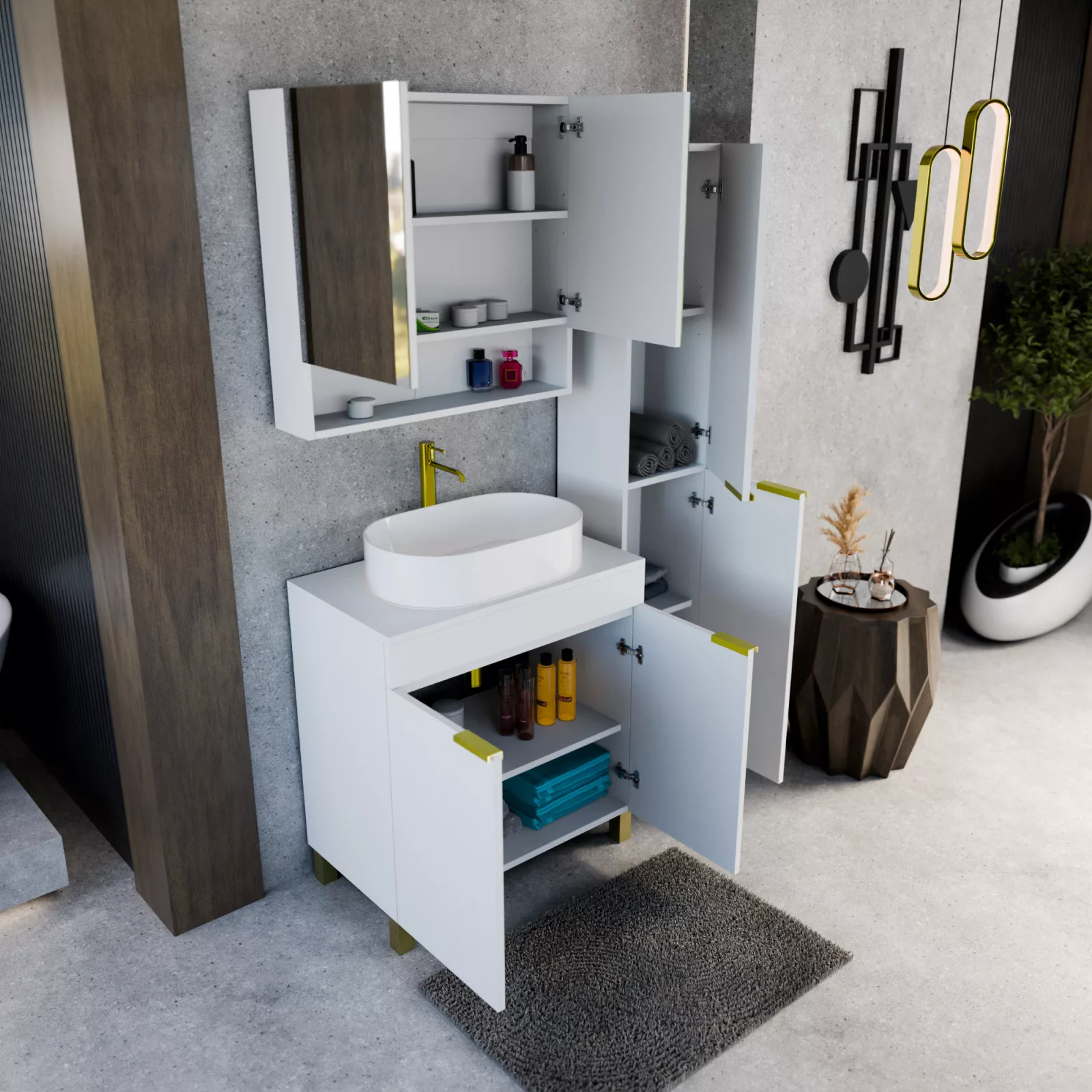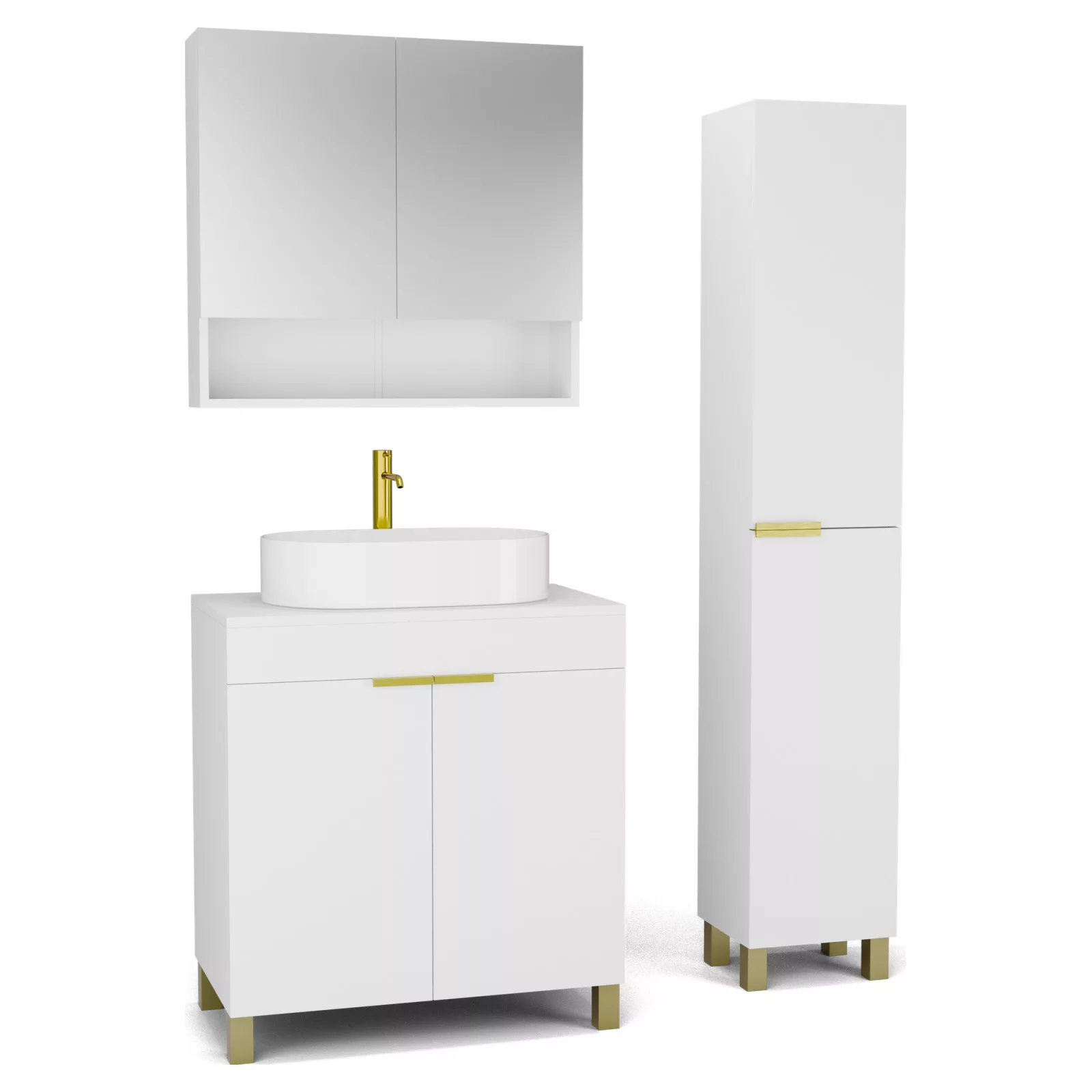 Saját márkás 80 cm széles komplett fürdőszoba bútor álló mosdószekrénnyel matt fehér színben, szálcsiszolt arany fogantyúkkal és lábakkal, matt fehér színű mosdópulttal, tükrös szekrénnyel és magasszekrénnyel.
