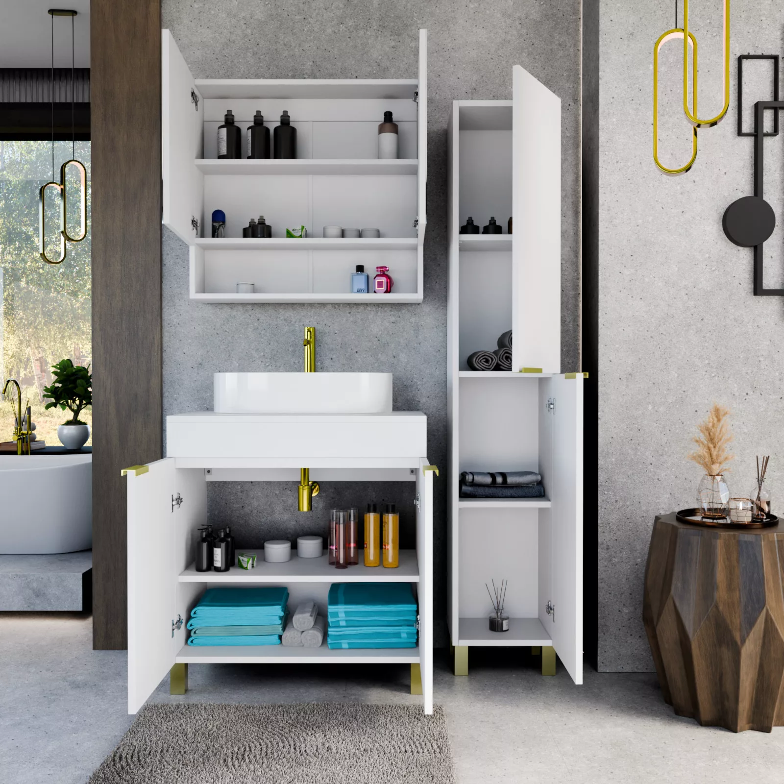 HD Paris Matt White 80 komplett fürdőszoba bútor szett álló mosdószekrénnyel, szálcsiszolt arany elemekkel, matt fehér mosdópulttal, tükrös szekrénnyel és magasszekrénnyel