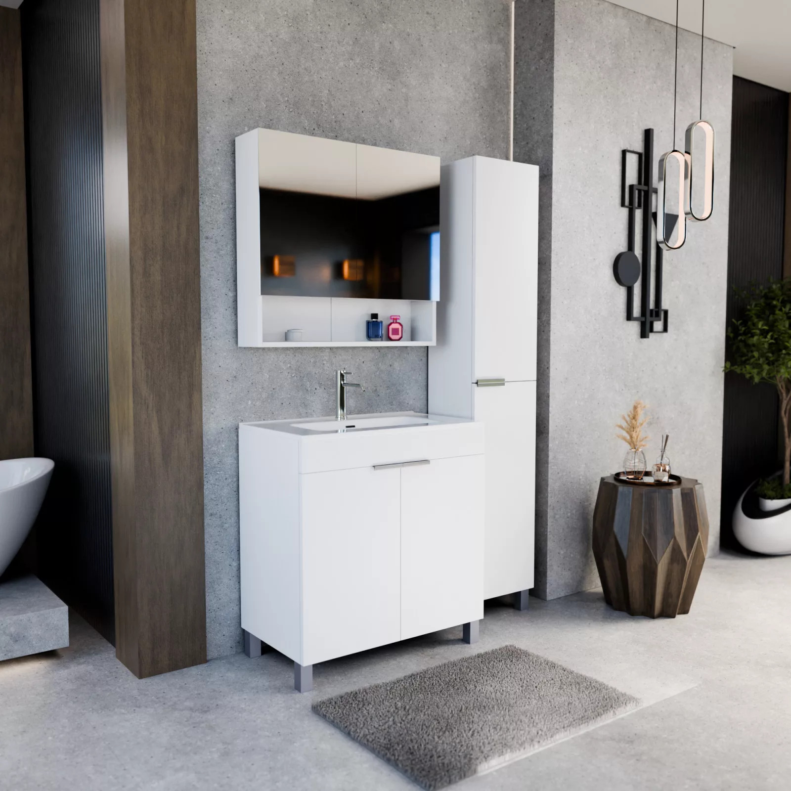 Napjainkban a praktikum mellett a fürdőszoba esztétikus megjelenése is fontos szempont. A lábon álló bútorok egyre elterjedtebbé válnak, mivel számos előnnyel rendelkeznek, ide sorolható a modern, könnyed megjelenés és az egyszerű tisztítás. A lábon álló fürdőszobai bútorok a klasszikus és modernebb stílusú fürdőszobákban is megállják a helyüket egyaránt. Nagyfokú rugalmasság jellemzi őket, mivel szinte bárhol elhelyezhetők a fürdőszobán belül. További előnyük, hogy soft close (csillapítós) zsanérral felszereltek, így becsukáskor az ajtó vagy fiók finoman záródik be, csökkentve a terhelést és növelve az élettartamot. A szekrény fehér és fekete mosdóval szabadon kombinálható ízlés szerint. A teljesség érdekében a mosdószekrényekhez illő keretes fali tükröt és magasszekrényt is választhatunk, hogy a fürdőszobában lévő bútorok egy szemet gyönyörködtető egységet alkossanak.