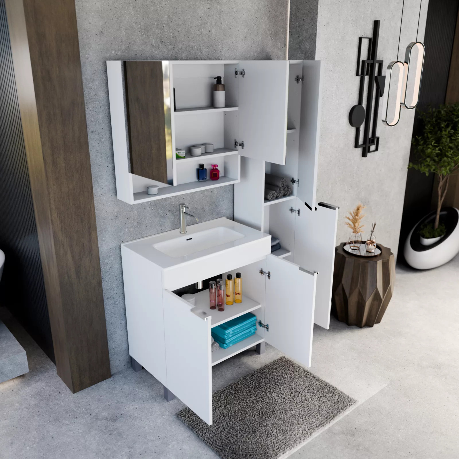 A Paris bútor család szettben is kapható. A mosdószekrény hozzáillő tükörrel és magas szekrénnyel kiváló komplett fürdőszoba bútor szett lehet bármilyen fürdőszobába.