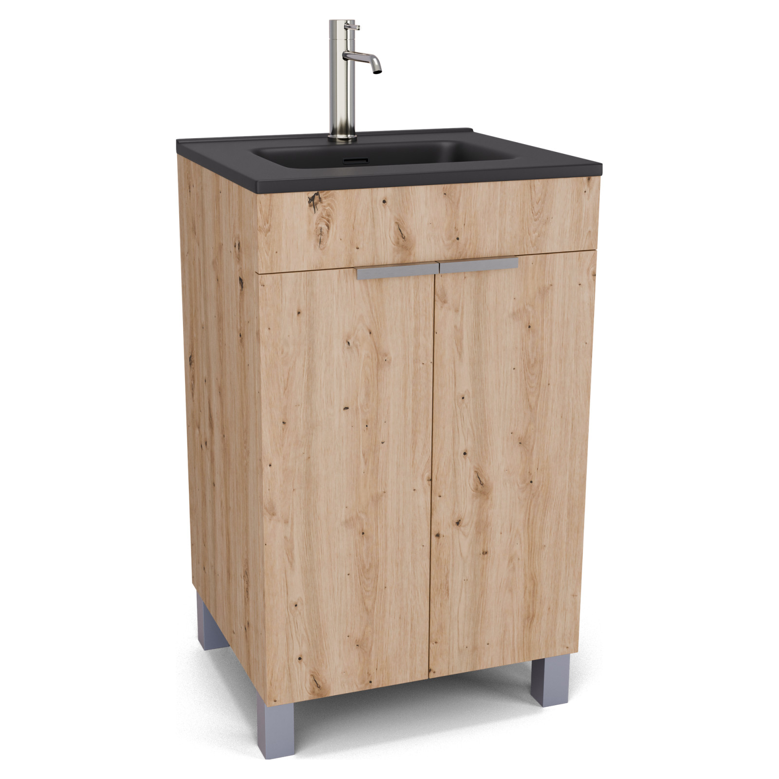 Saját márkás 50 cm széles álló mosdószekrény tölgyfa színben, szálcsiszolt króm fogantyúkkal és lábakkal, fekete slim mosdóval, soft-close zsanérokkal ellátva.