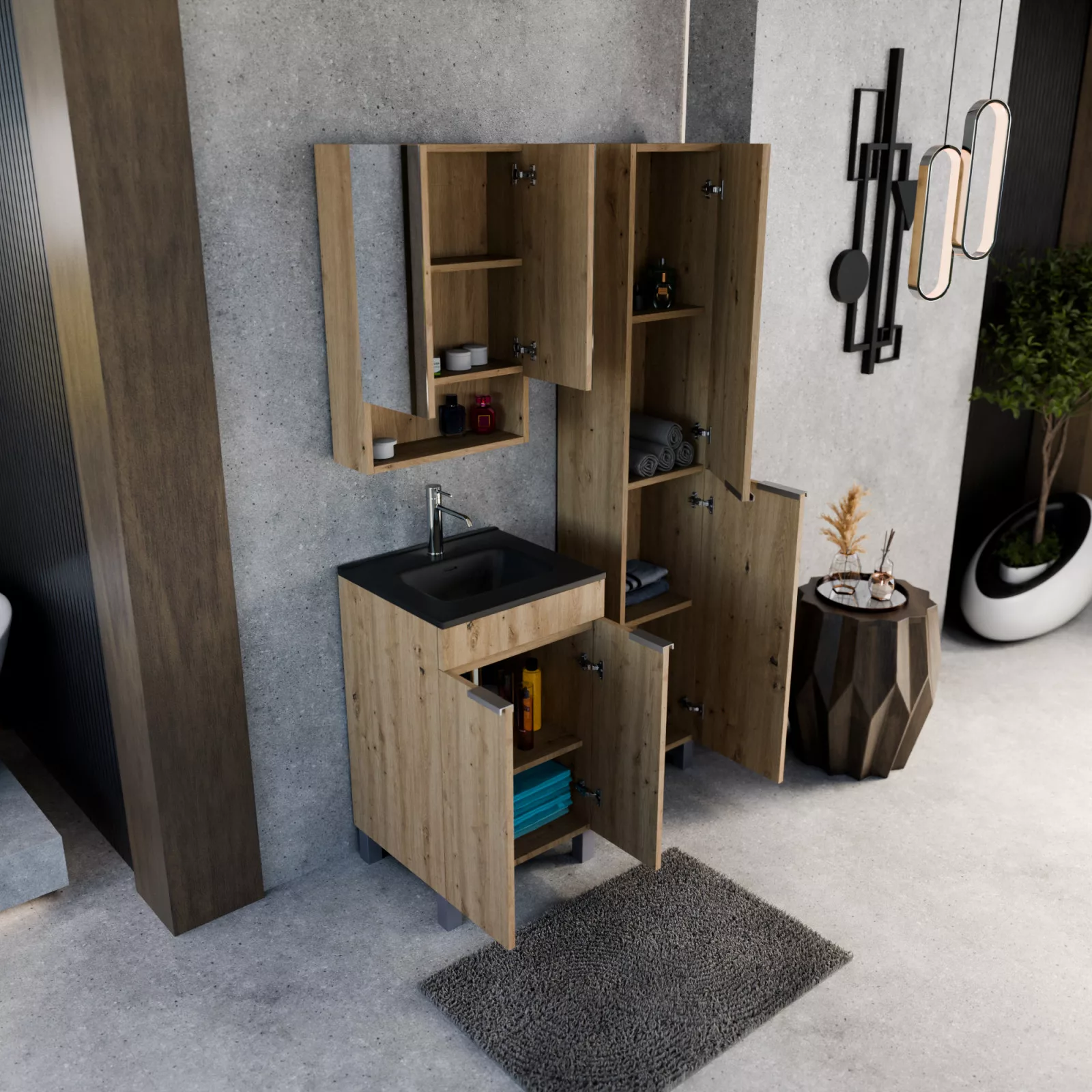 Napjainkban a praktikum mellett a fürdőszoba esztétikus megjelenése is fontos szempont. A lábon álló bútorok egyre elterjedtebbé válnak, mivel számos előnnyel rendelkeznek, ide sorolható a modern, könnyed megjelenés és az egyszerű tisztítás. A lábon álló fürdőszobai bútorok a klasszikus és modernebb stílusú fürdőszobákban is megállják a helyüket egyaránt. Nagyfokú rugalmasság jellemzi őket, mivel szinte bárhol elhelyezhetők a fürdőszobán belül. További előnyük, hogy soft close (csillapítós) zsanérral felszereltek, így  becsukáskor az ajtó vagy fiók finoman záródik be, csökkentve a terhelést és növelve az élettartamot. A szekrény fehér és matt fekete mosdóval, illetve mosdópulttal is szabadon kombinálható ízlés szerint. A teljesség érdekében a mosdószekrényekhez illő tükrös szekrényt és magas szekrényt is választhatunk, hogy a fürdőszobában lévő bútorok egy szemet gyönyörködtető egységet alkossanak.