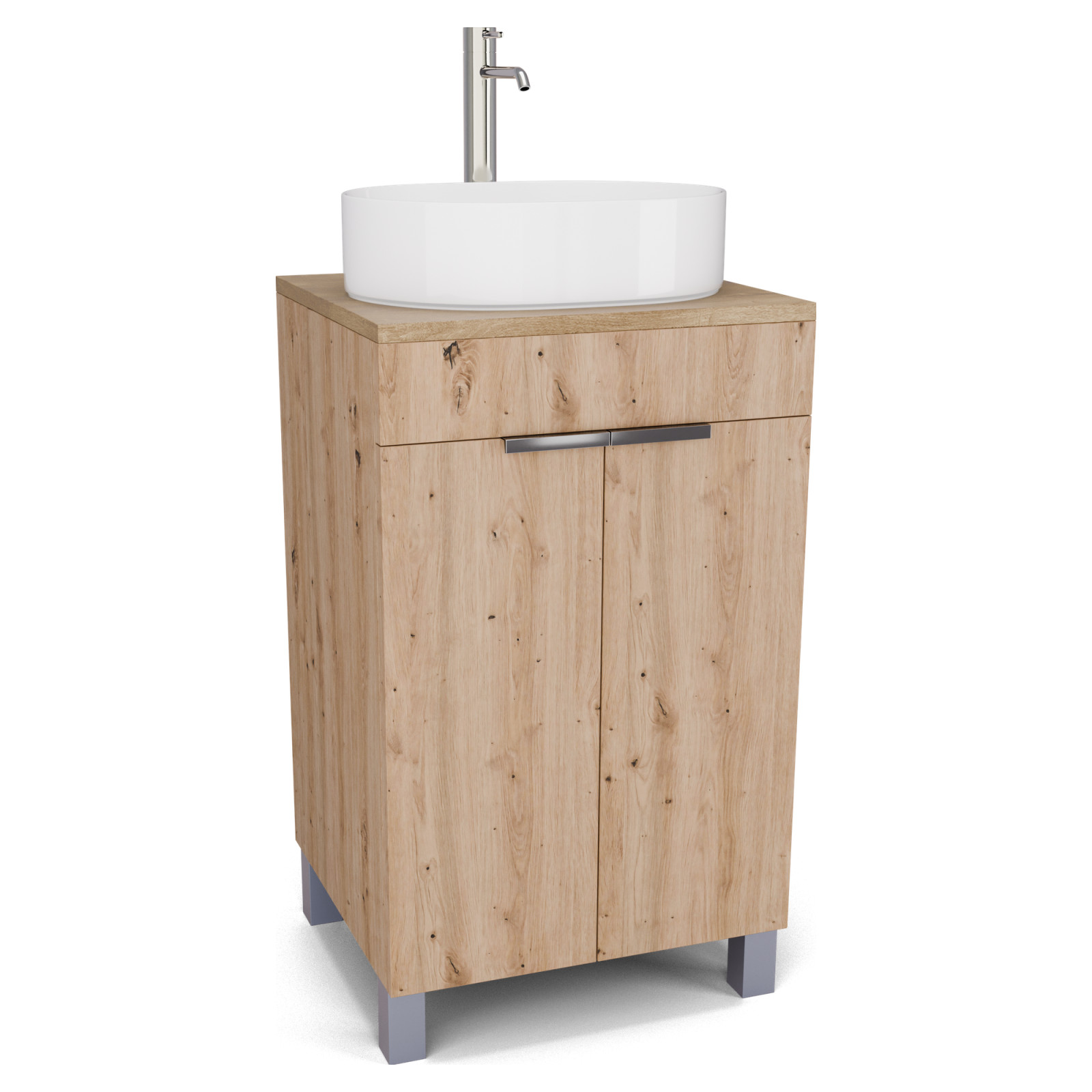 Saját márkás 50 cm széles álló mosdószekrény tölgyfa színben, fényes króm fogantyúkkal és lábakkal, tölgyfa színű mosdópulttal, soft-close zsanérokkal ellátva.