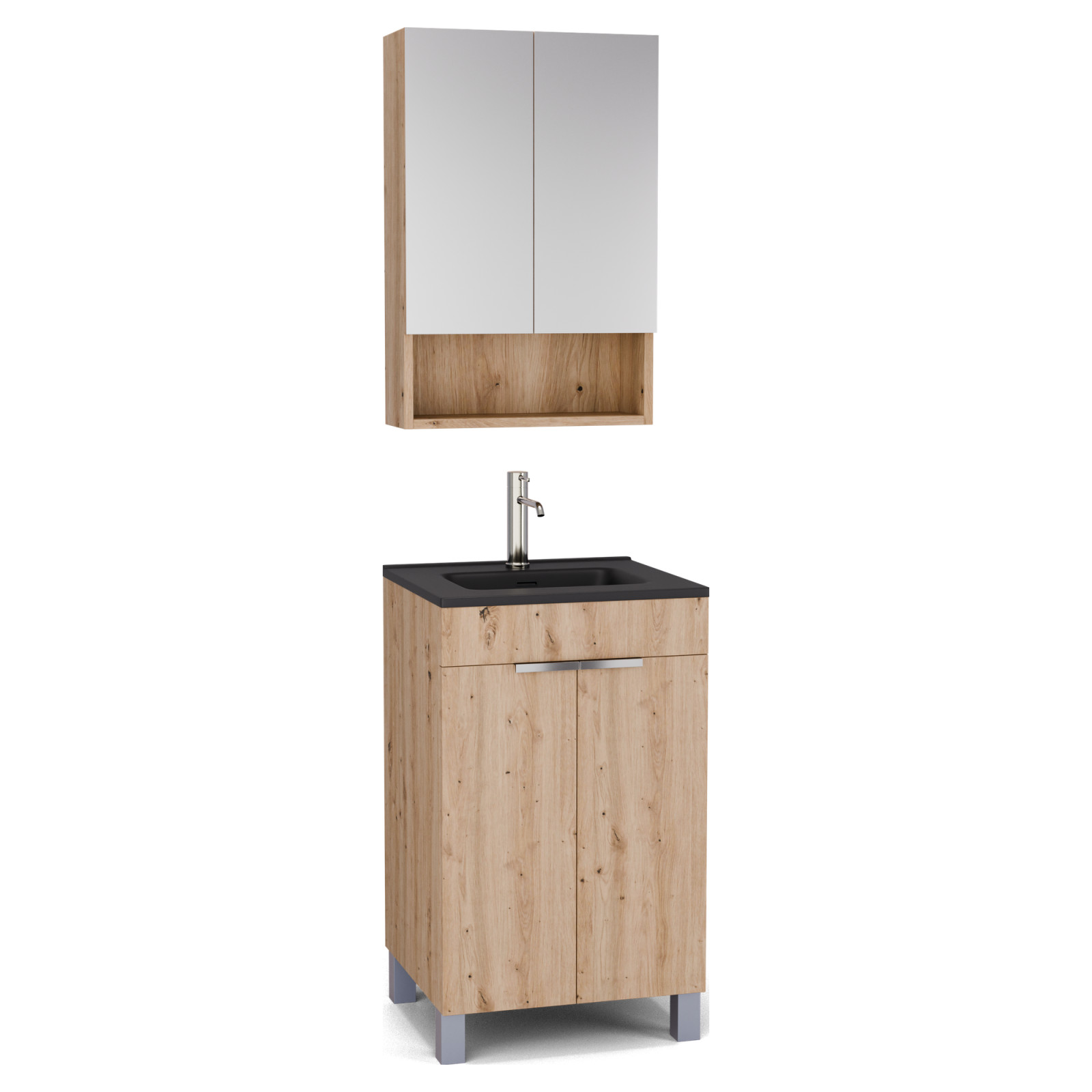 Saját márkás 50 cm széles komplett fürdőszoba bútor álló mosdószekrénnyel tölgyfa színben, fényes króm fogantyúkkal és lábakkal, fekete slim mosdóval és fali tükrös szekrénnyel.
