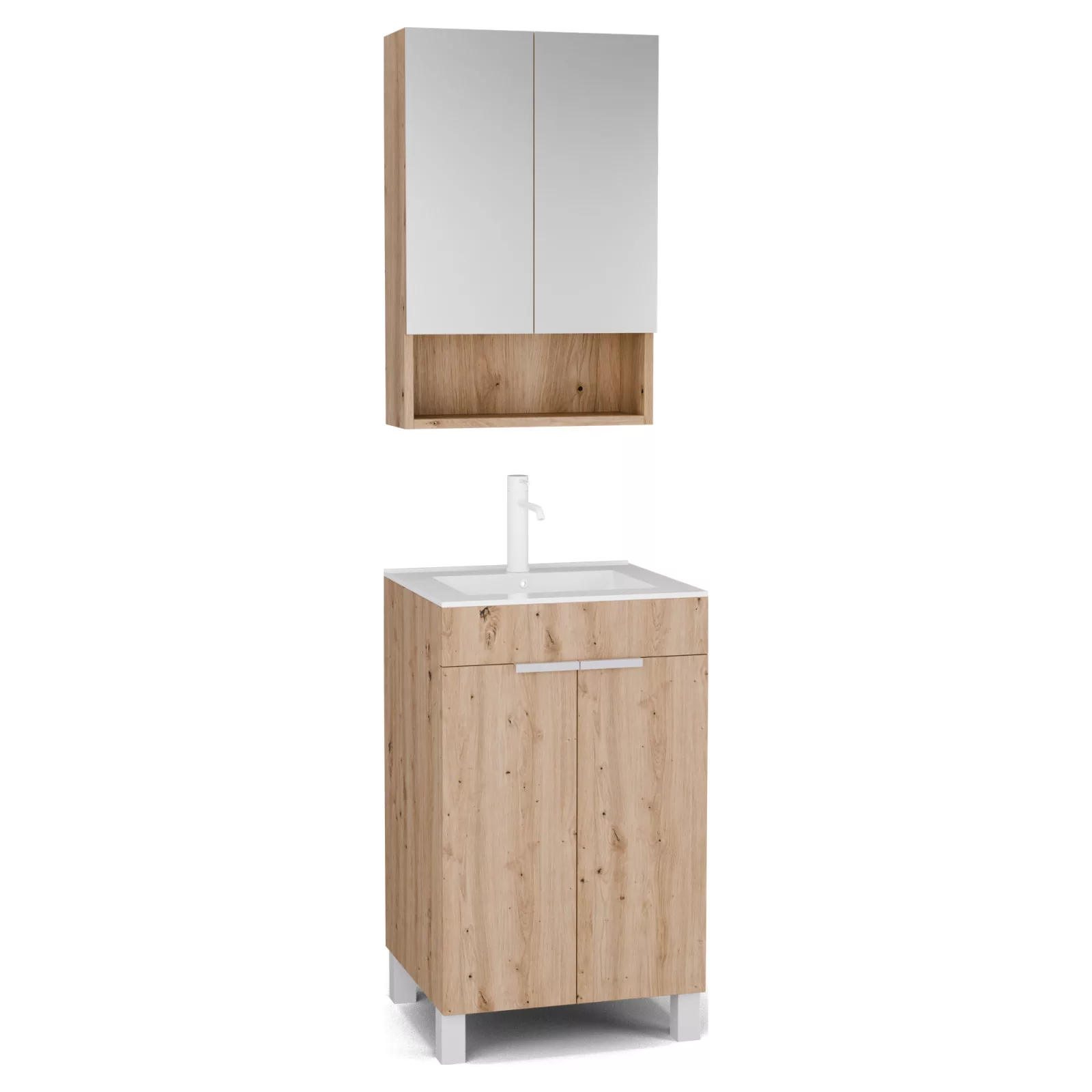 Saját márkás 60 cm széles komplett fürdőszoba bútor álló mosdószekrénnyel tölgyfa színben, matt fehér fogantyúkkal és lábakkal és fali tükrös szekrénnyel.