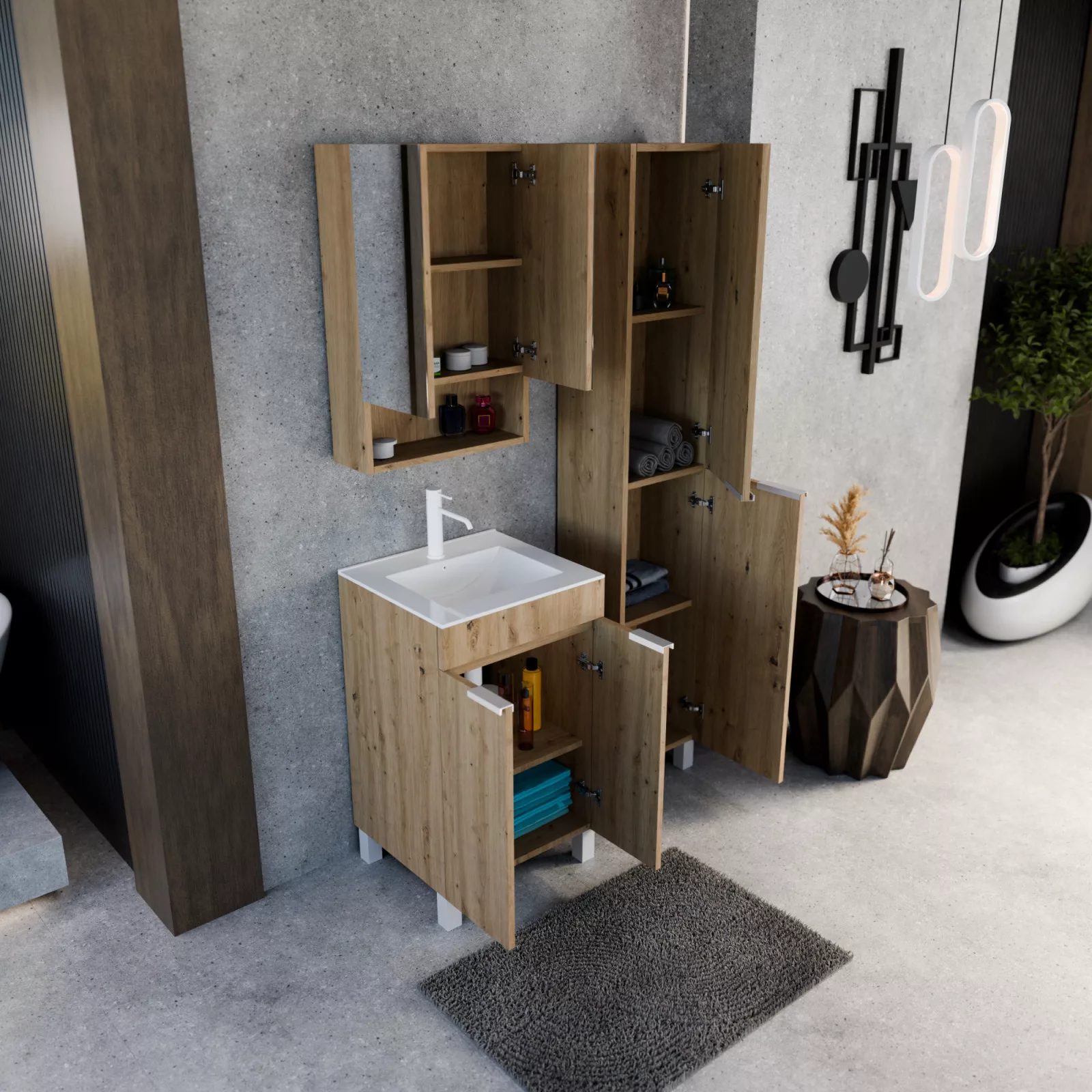 Paris Oak 50 komplett fürdőszoba bútor, matt fehér fogantyúkkal