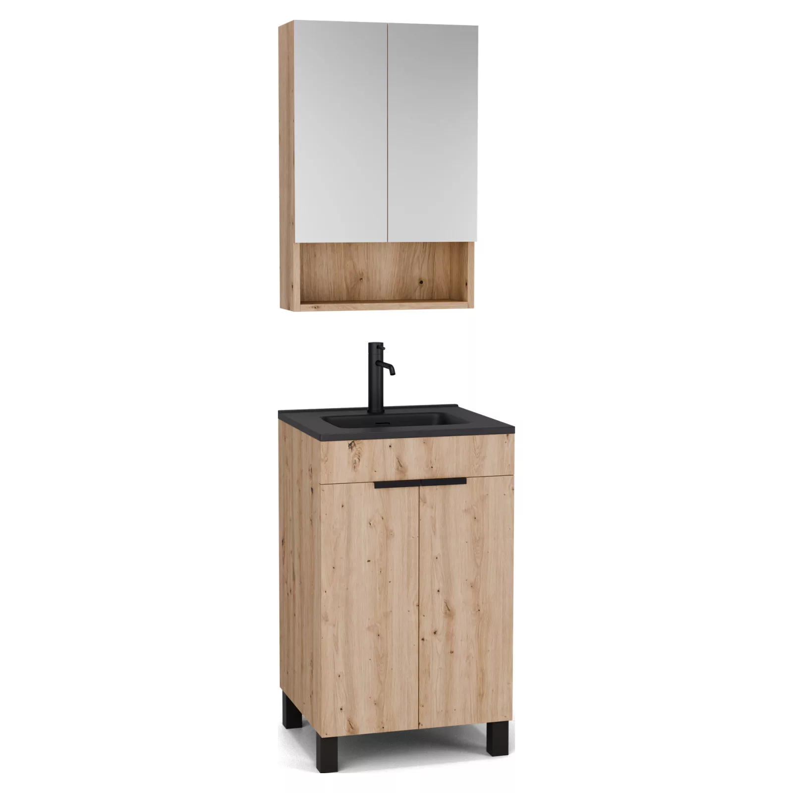 HD Paris Oak 50 komplett fürdőszoba bútor álló mosdószekrénnyel, matt fekete elemekkel, matt fekete slim mosdóval és tükrös szekrénnyel