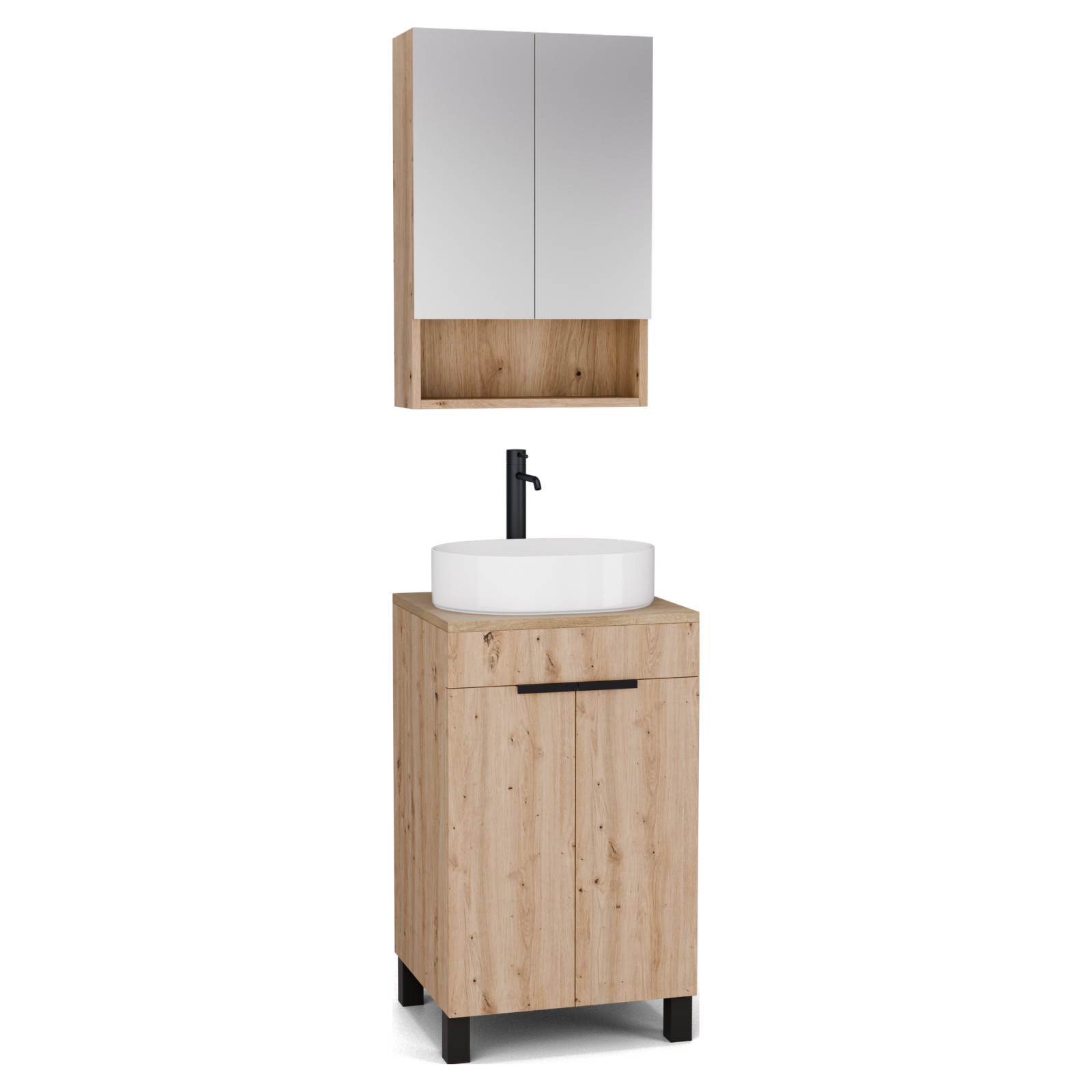 Saját márkás 50 cm széles komplett fürdőszoba bútor álló mosdószekrénnyel tölgyfa színben, matt fekete fogantyúkkal és lábakkal, tölgyfa színű mosdópulttal és fali tükrös szekrénnyel.
