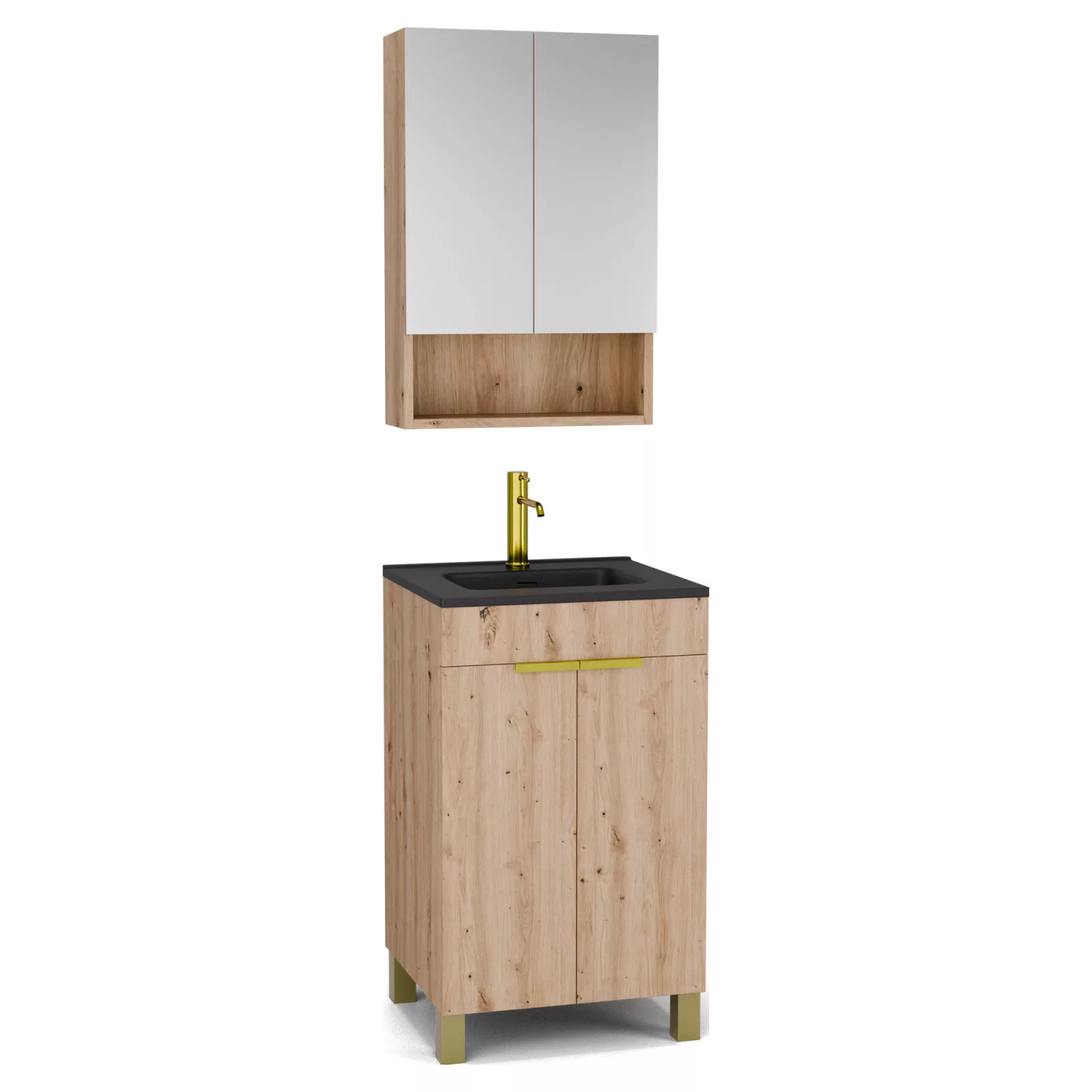 HD Paris Oak 50 komplett fürdőszoba bútor álló mosdószekrénnyel, szálcsiszolt arany elemekkel, matt fekete slim mosdóval és tükrös szekrénnyel
