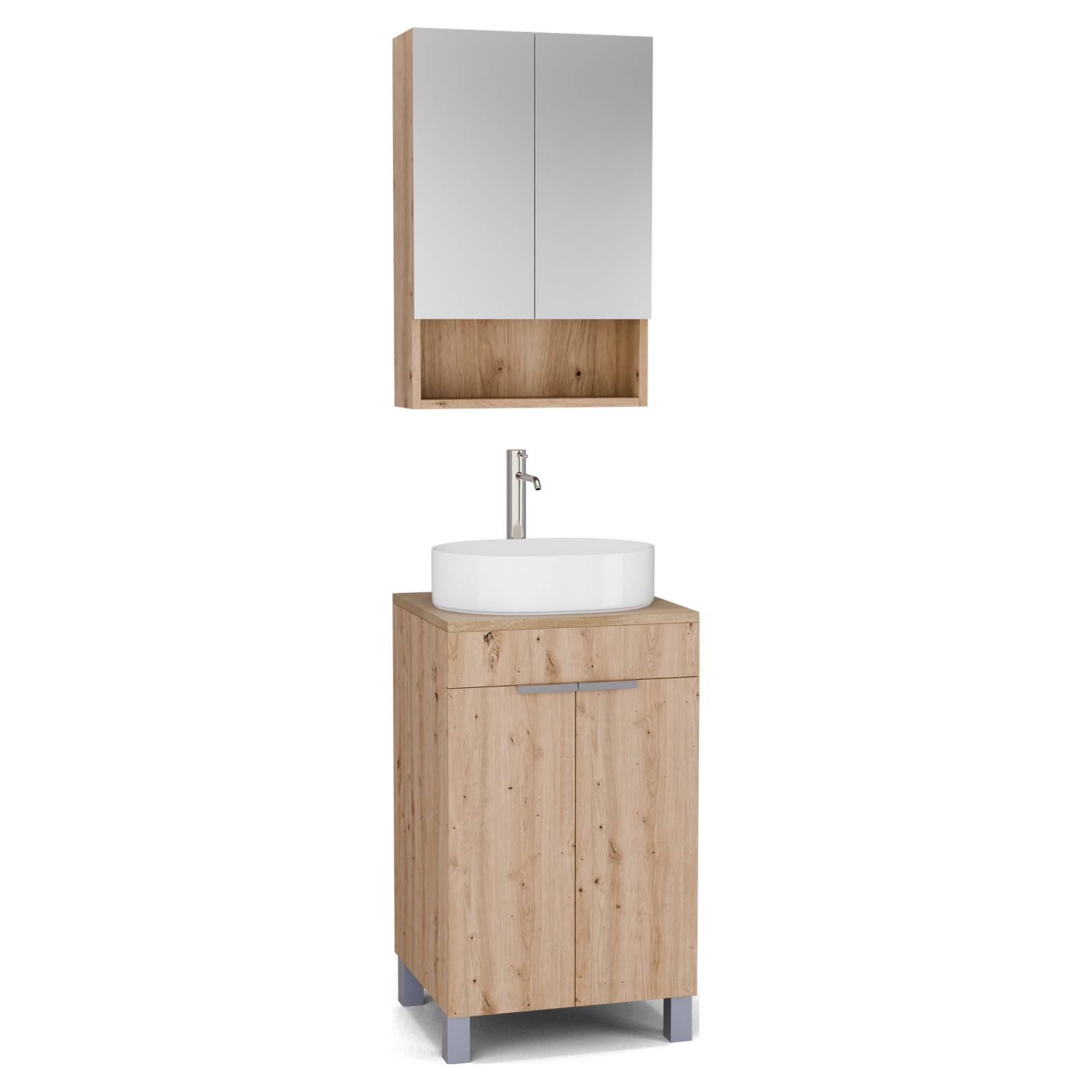 Saját márkás 50 cm széles komplett fürdőszoba bútor álló mosdószekrénnyel tölgyfa színben, szálcsiszolt króm fogantyúkkal és lábakkal, tölgyfa színű mosdópulttal és fali tükrös szekrénnyel.