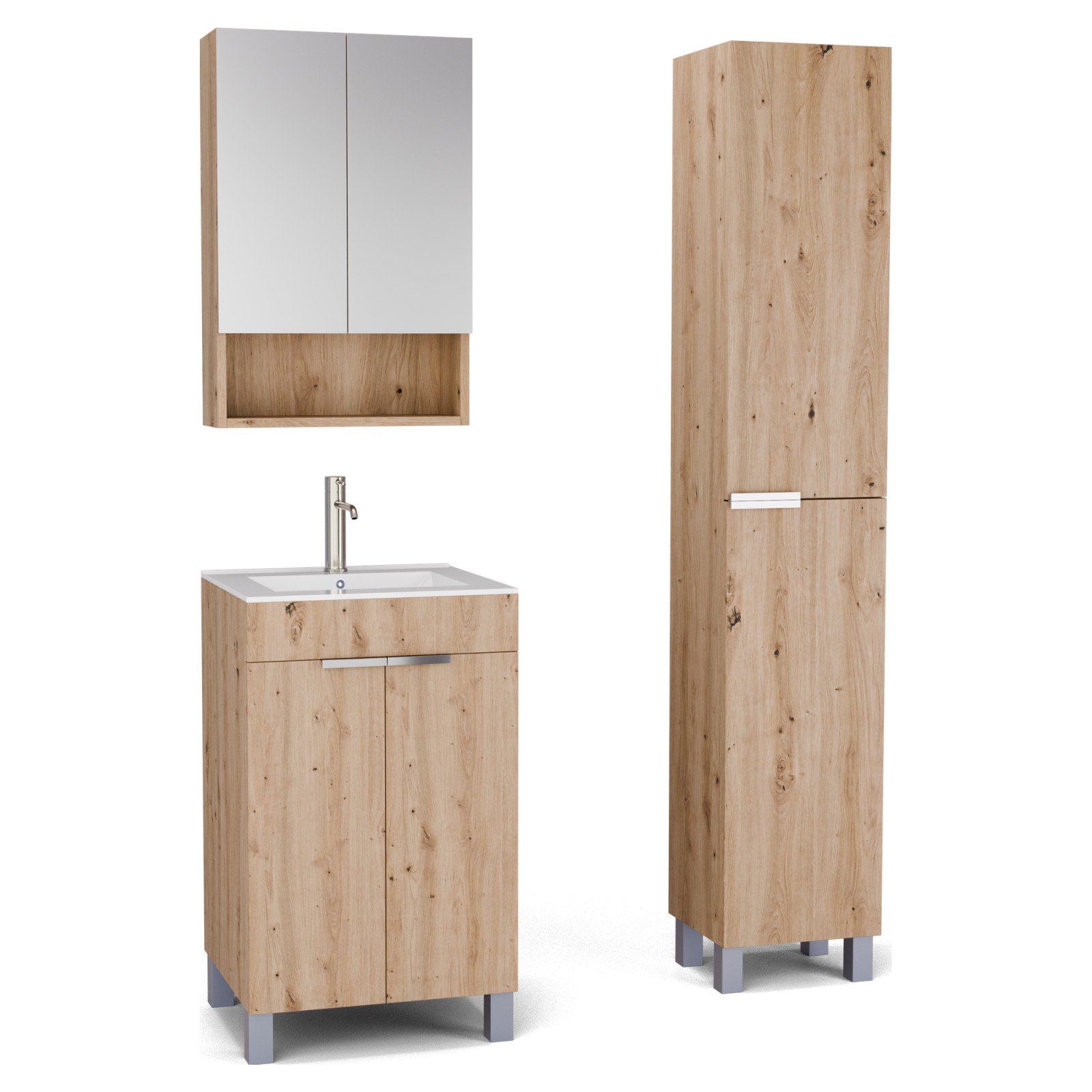 HD Paris Oak 50 komplett fürdőszoba bútor szett álló mosdószekrénnyel, fényes króm elemekkel, fényes fehér slim mosdóval, tükrös szekrénnyel és magasszekrénnyel